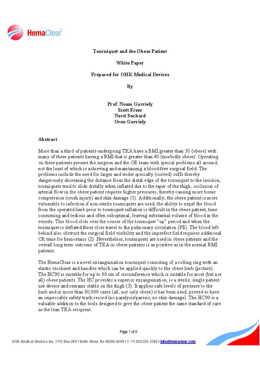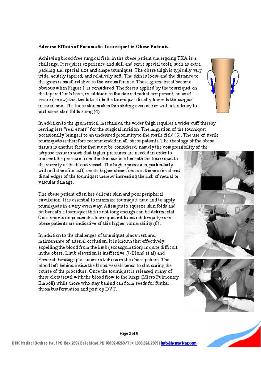 HemaClear®的驱血效果更优,是一种无菌、单人使用的装置,能稳定的停留在大腿上。此装置在8万多例手术中(不仅仅是肥胖患者)为肢体提供了安全的压力,获得了良好的安全记录(无瘫痪/麻痹,无皮肤损伤)。