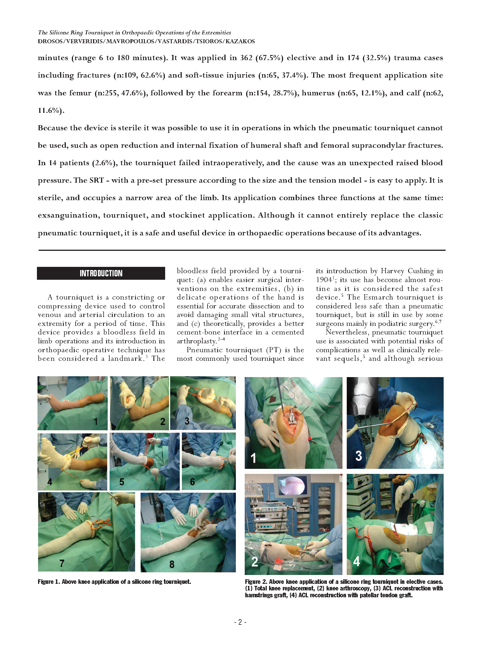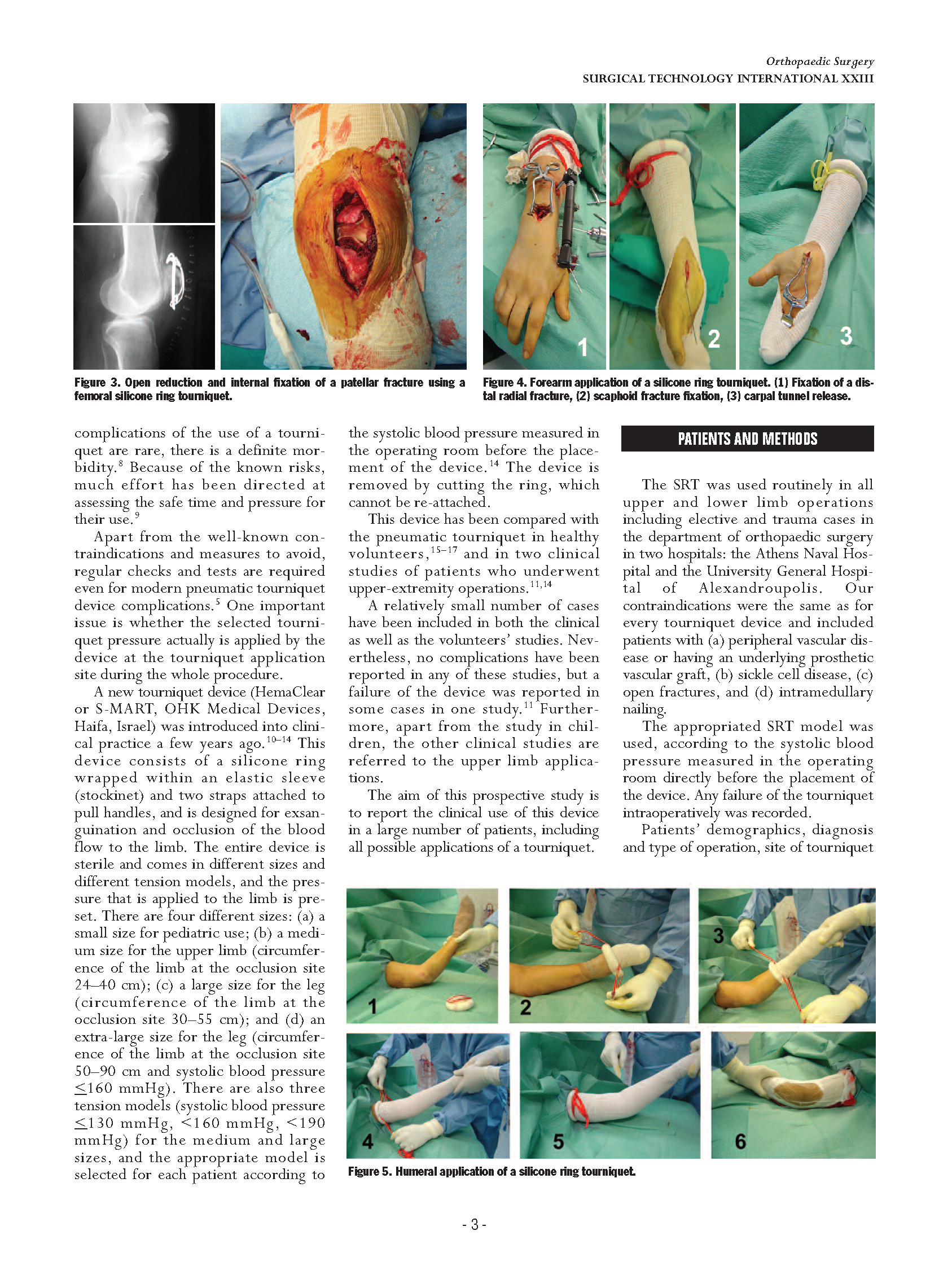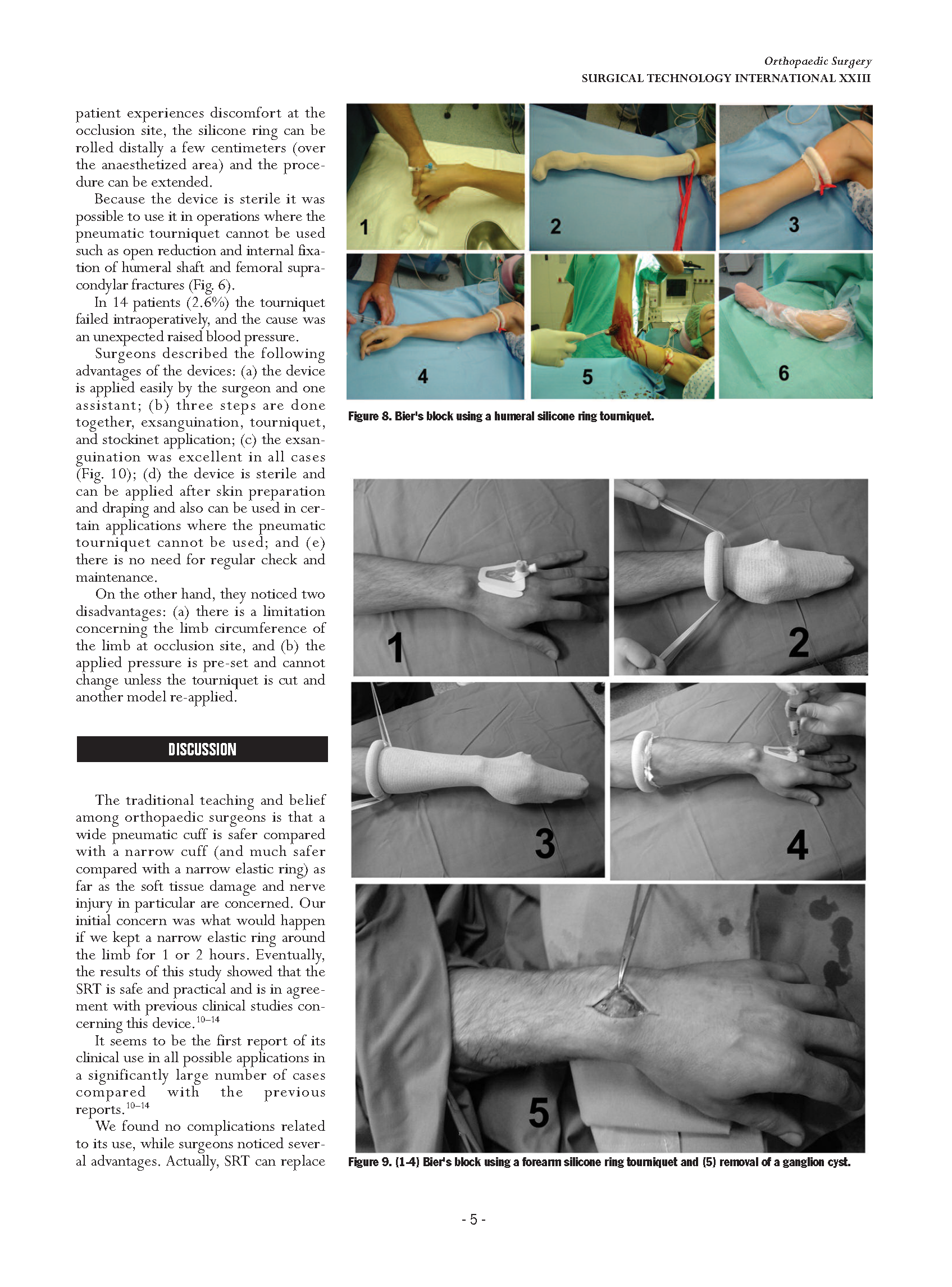 因为这个无菌装置是可以做得到常规的充气止血带不能手术到的地方,例如切开复位术、肱上膊的内固定、大腿骨髁的断裂。14位患者(占总人数的2.6%)在术中使用止血带不成功,引起了血压升高。硅橡胶环操作起来是非常方便的,因为它的压力是根据尺寸和张力模式来设定的。OHK驱血止血装置是无菌的并且使用的时候在四肢的占用的空间也很小。它的应用同时包含有3个作用:驱血,止血,像袜子一样的应用。虽然它不能完全的取代传统的气囊止血带,但是因为它的先进性可在整形外科中安全的使用。