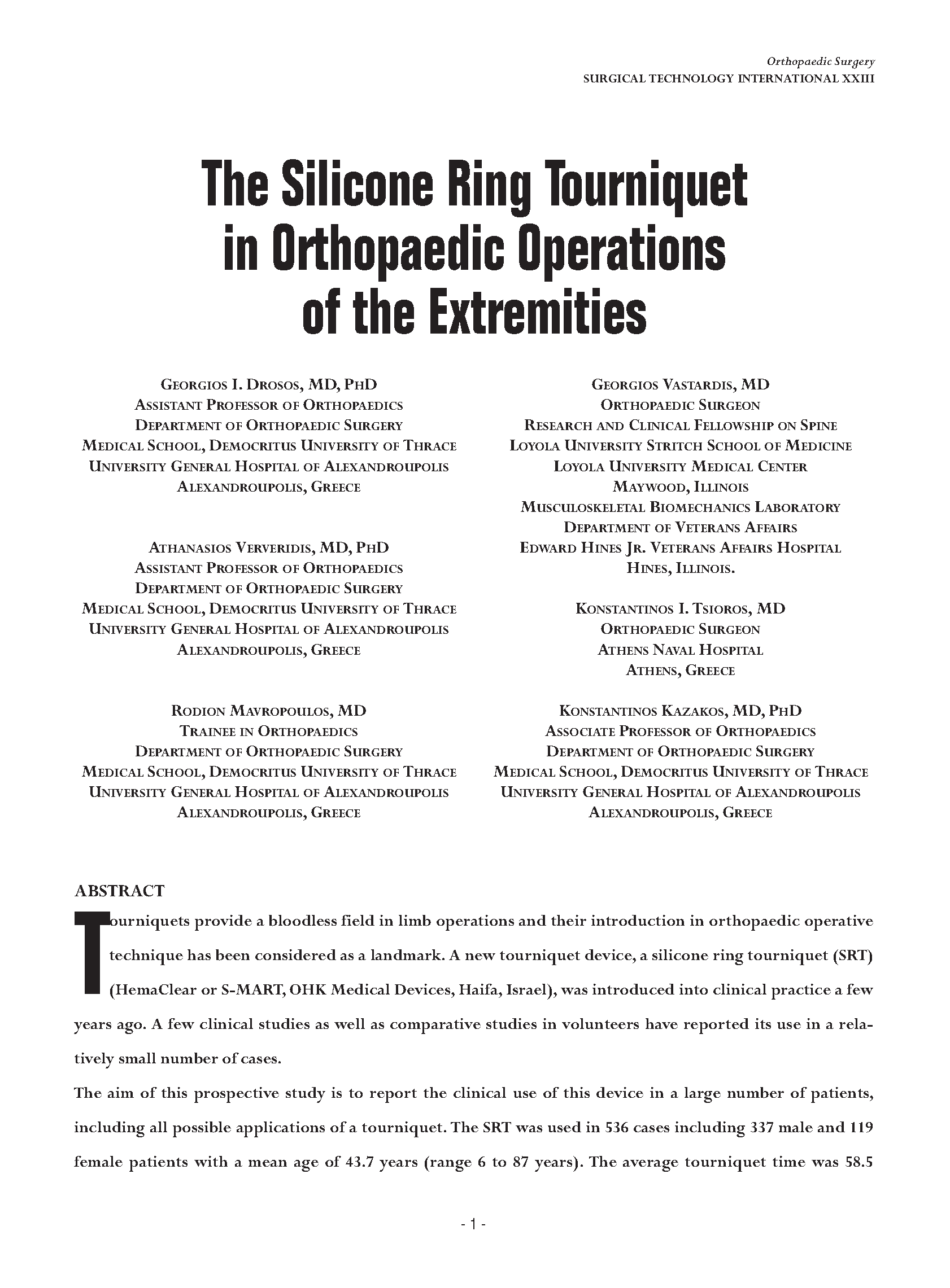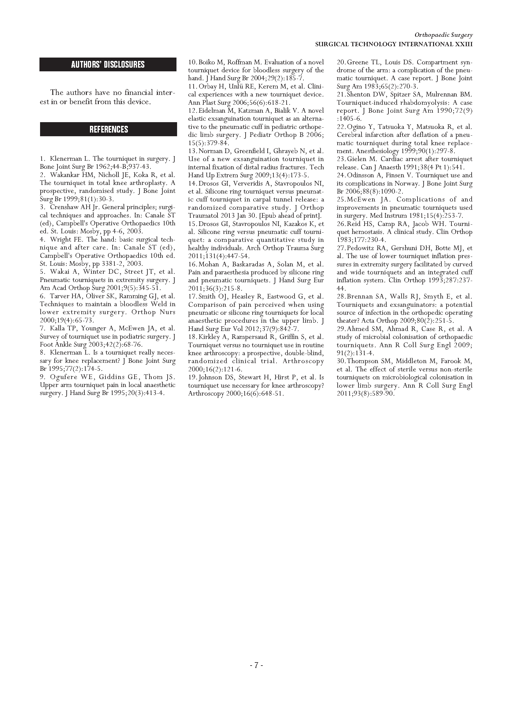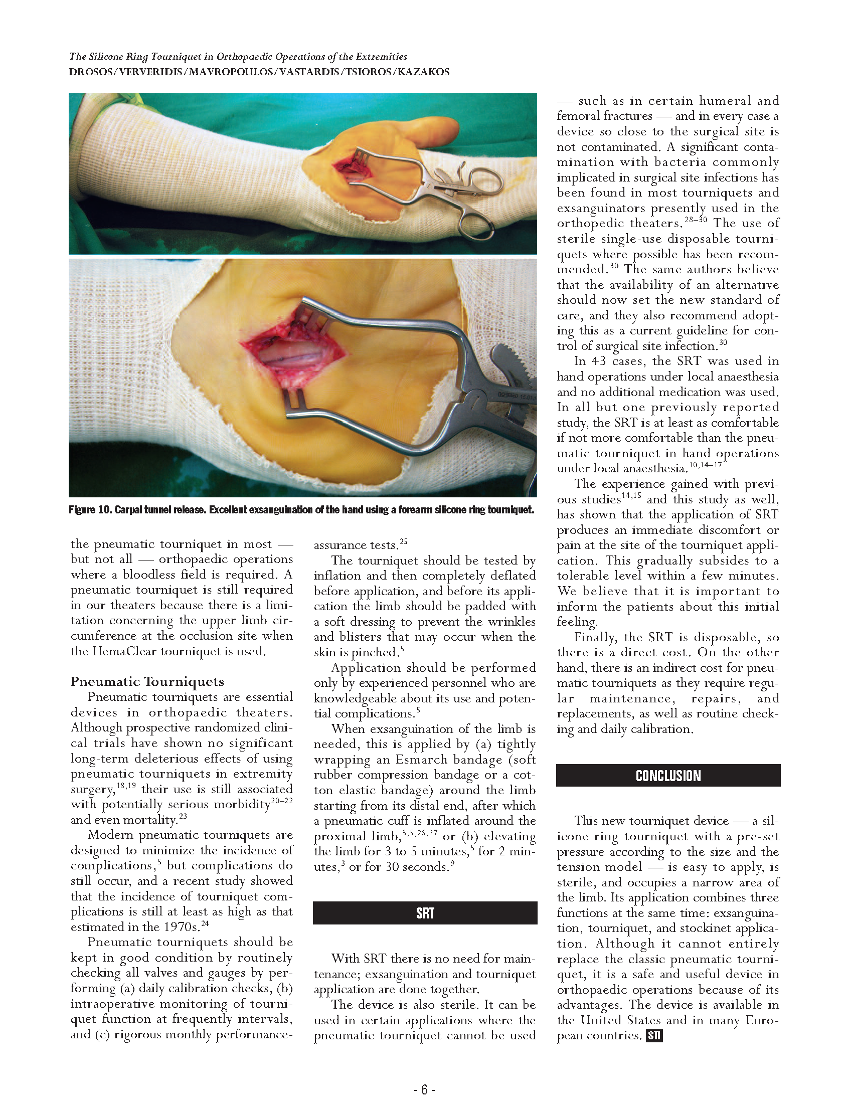 因为这个无菌装置是可以做得到常规的充气止血带不能手术到的地方,例如切开复位术、肱上膊的内固定、大腿骨髁的断裂。14位患者(占总人数的2.6%)在术中使用止血带不成功,引起了血压升高。硅橡胶环操作起来是非常方便的,因为它的压力是根据尺寸和张力模式来设定的。OHK驱血止血装置是无菌的并且使用的时候在四肢的占用的空间也很小。它的应用同时包含有3个作用:驱血,止血,像袜子一样的应用。虽然它不能完全的取代传统的气囊止血带,但是因为它的先进性可在整形外科中安全的使用。