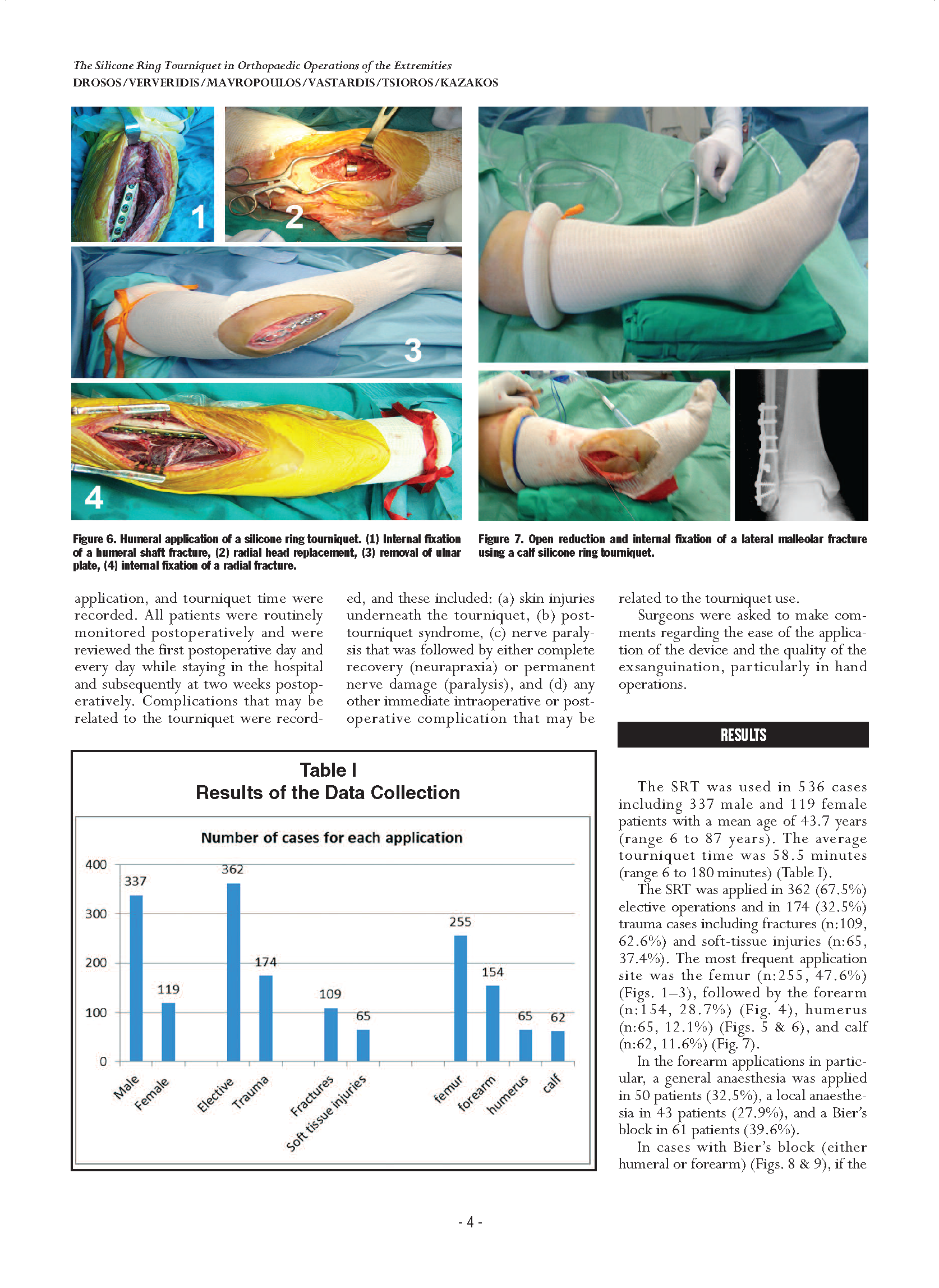 预期的研究希望可以报告出大量的临床病人用我们这个驱血止血装置,包括所有可能的止血带应用范围。应用在536个案例中,其中男性337名,女性119名,患者的平均年龄是43.7岁(年龄范围在6岁-87岁)。平均使用止血带的时间是58.5min(范围在6-180min)。362位患者(67.5%)是用于非必须性的手术中,174为患者(32.5%)用于创伤的案例中,包括109位(62.6%)骨折患者和65位(37.4%)软组织损伤患者。最常使用的部位是大腿骨(255位患者,占总比例的47.6%),接下来是前臂(154位患者,占总比例的28.7%),肱上膊(65位患者,占总比例的12.1%),小腿(62位患者,占总比例的11.6%)。