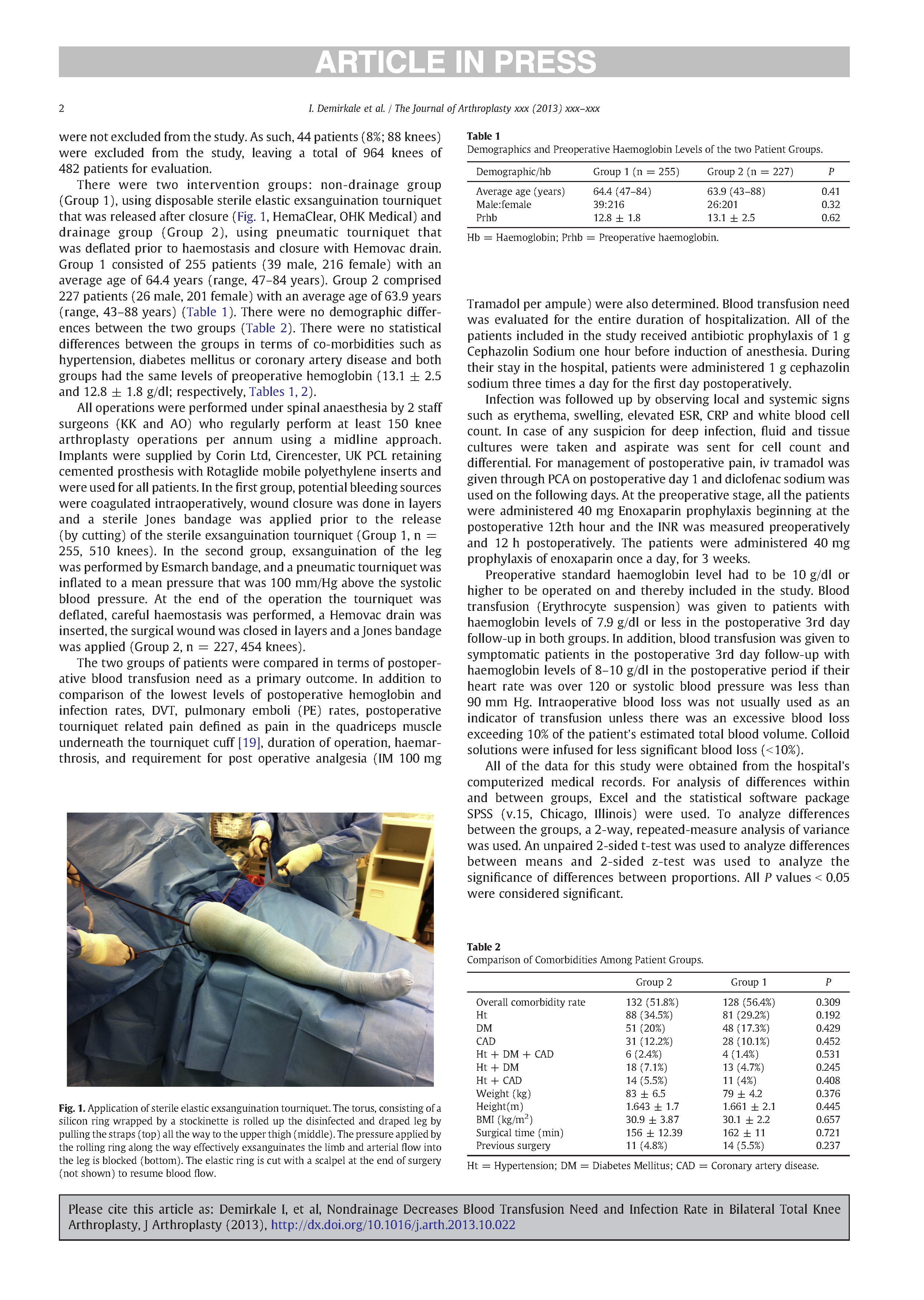 本回顾性研究招募了526名在我院接受双侧TKA手术患者。非引流组255名(510个膝盖,1组),使用驱血止血装置(HemaClear),使用琼斯绷带闭合伤口层,没有进行预止血。引流组227名(454个膝盖,2组),使用气囊止血带,使用琼斯绷带并在放气后止血。2组的血红蛋白下降量远大于1组(P < 0.001),感染率也远低于1组(P – 0.017)。伤口闭合后使用无菌止血带能减少输血量、感染率、止血带相关疼痛和术后并发症。