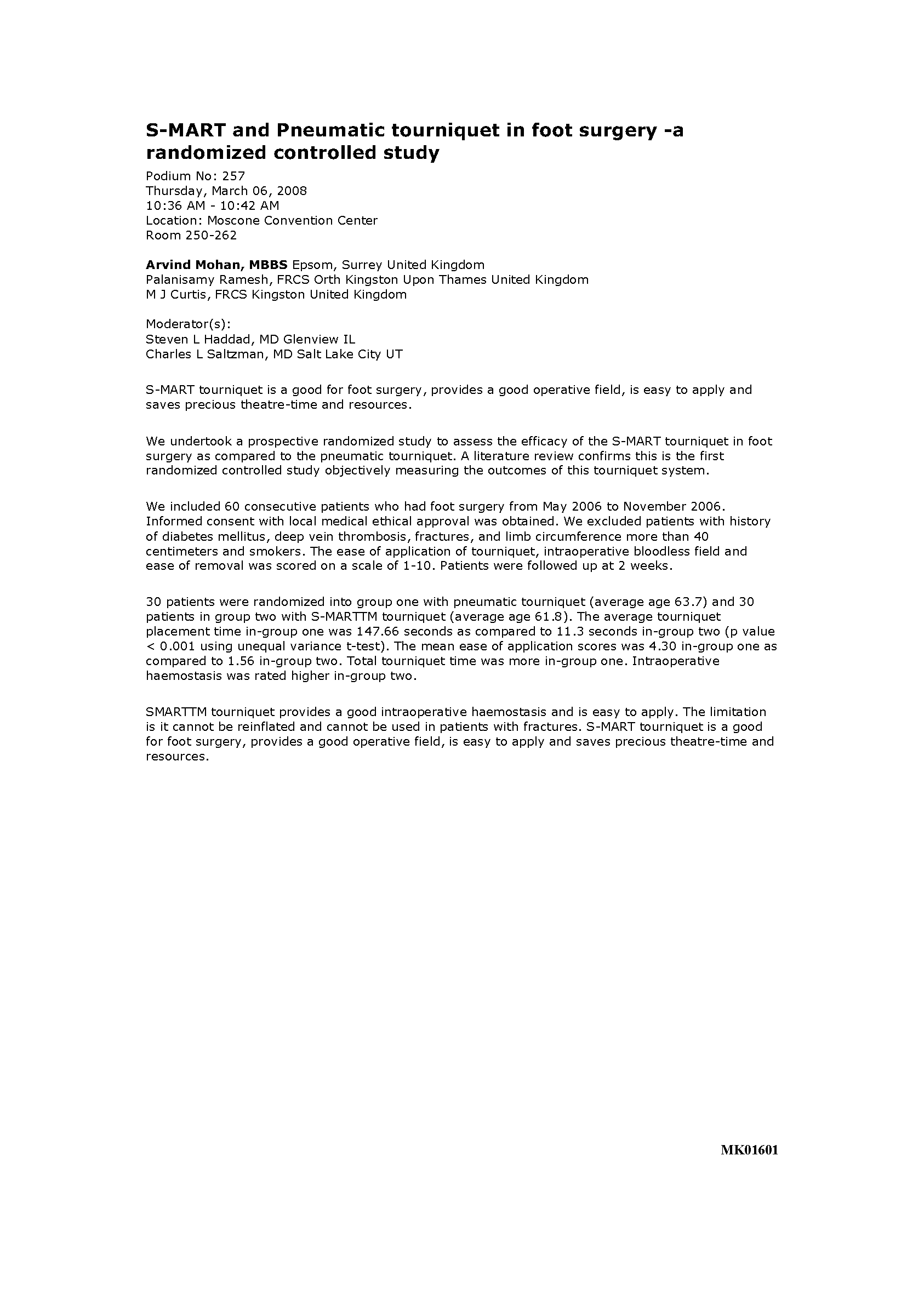 S-MART止血带提供一个好的术中无血区域,并且方便穿戴。使用限制是使用前包装不能破损,患者骨折的时候也不能用。S-MART在足外科手中是很好的选择,可以提供一个好的术野,方便穿戴,节省手术时间和基建费用。