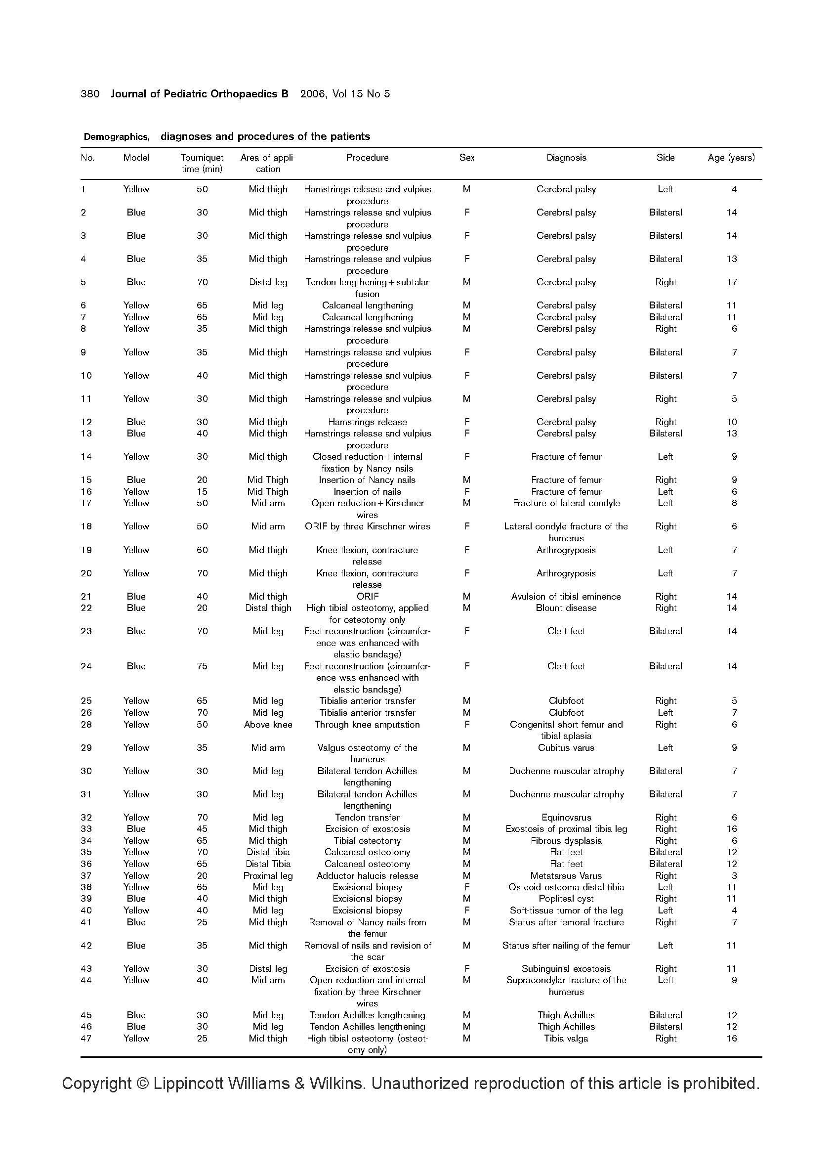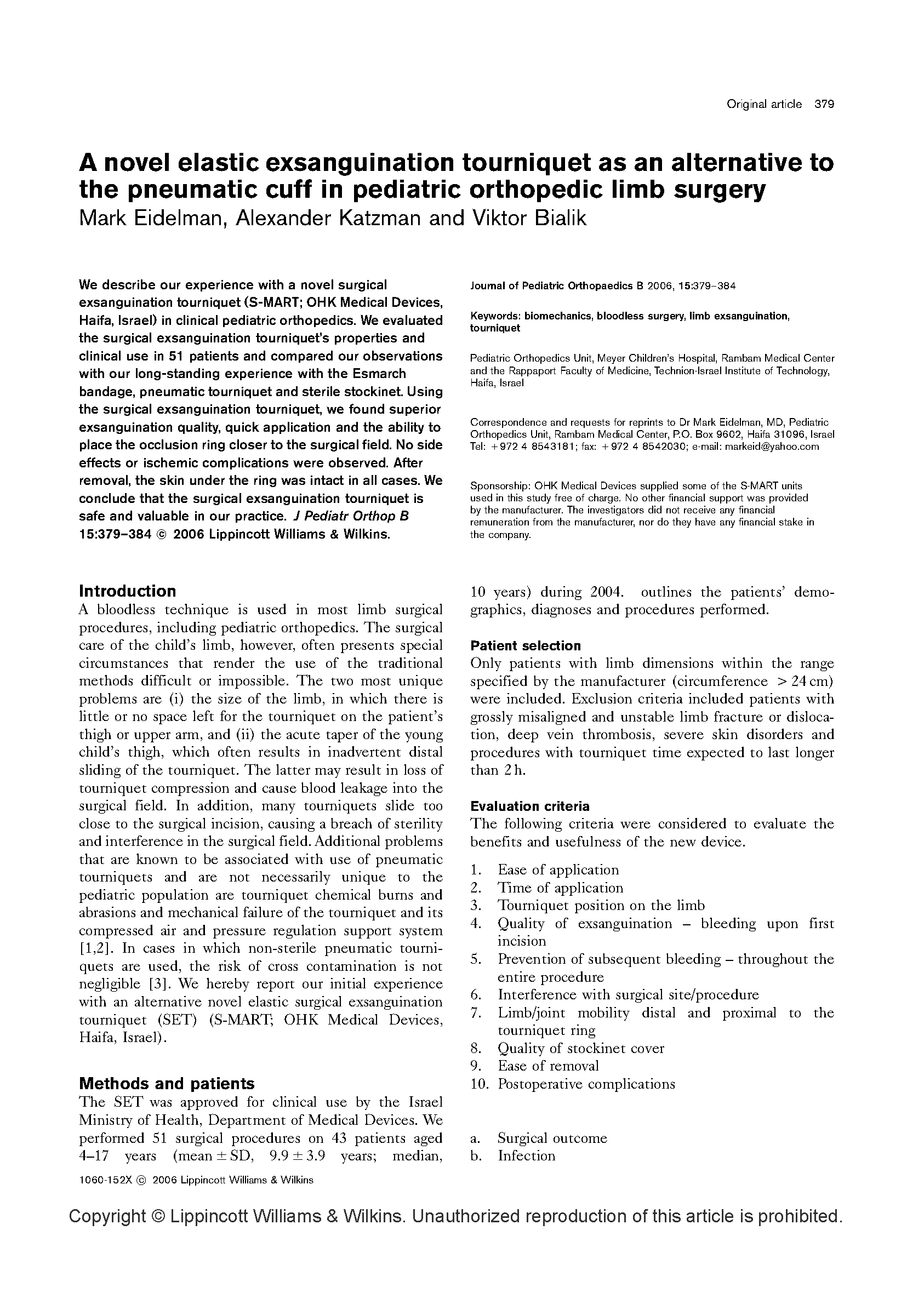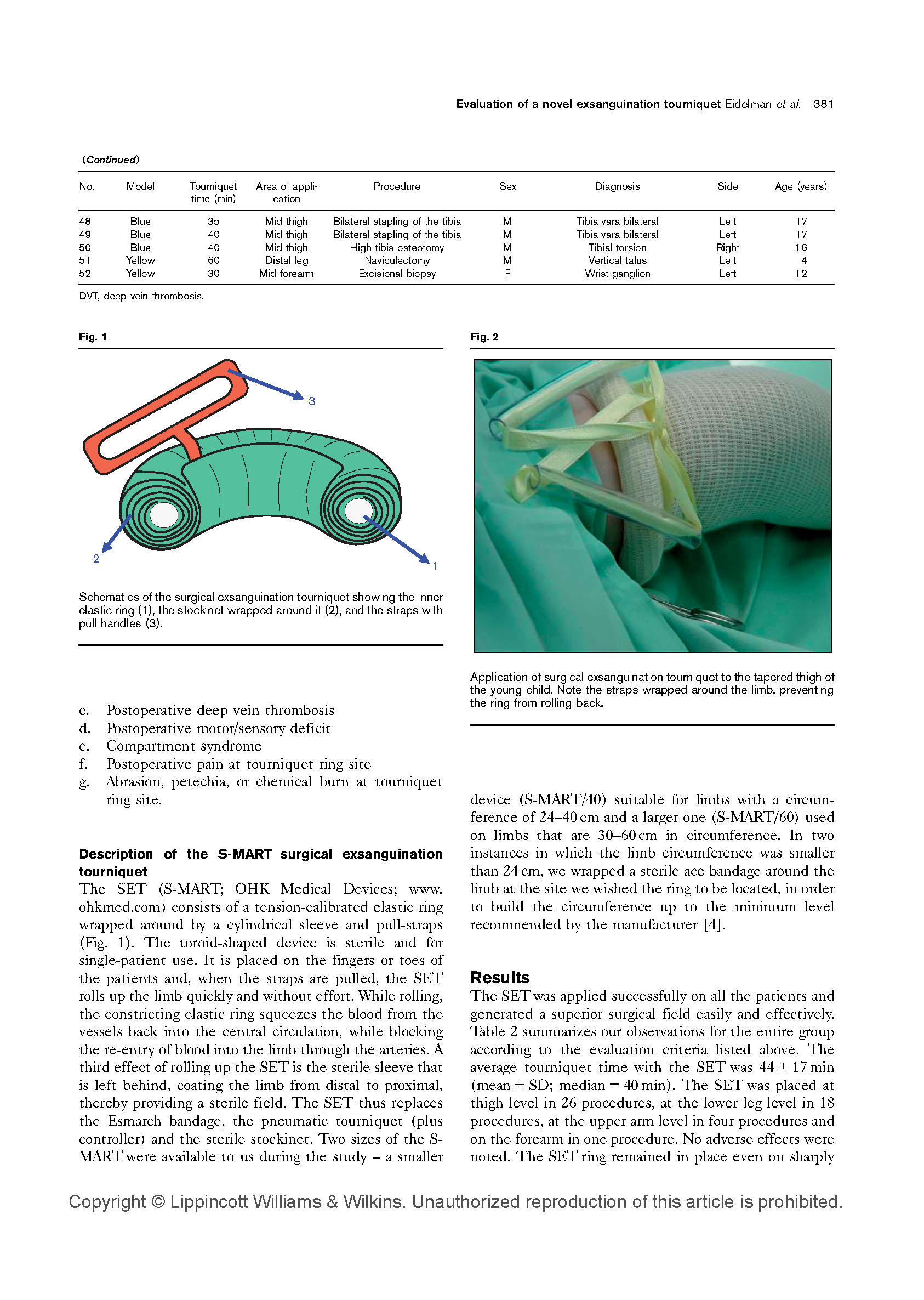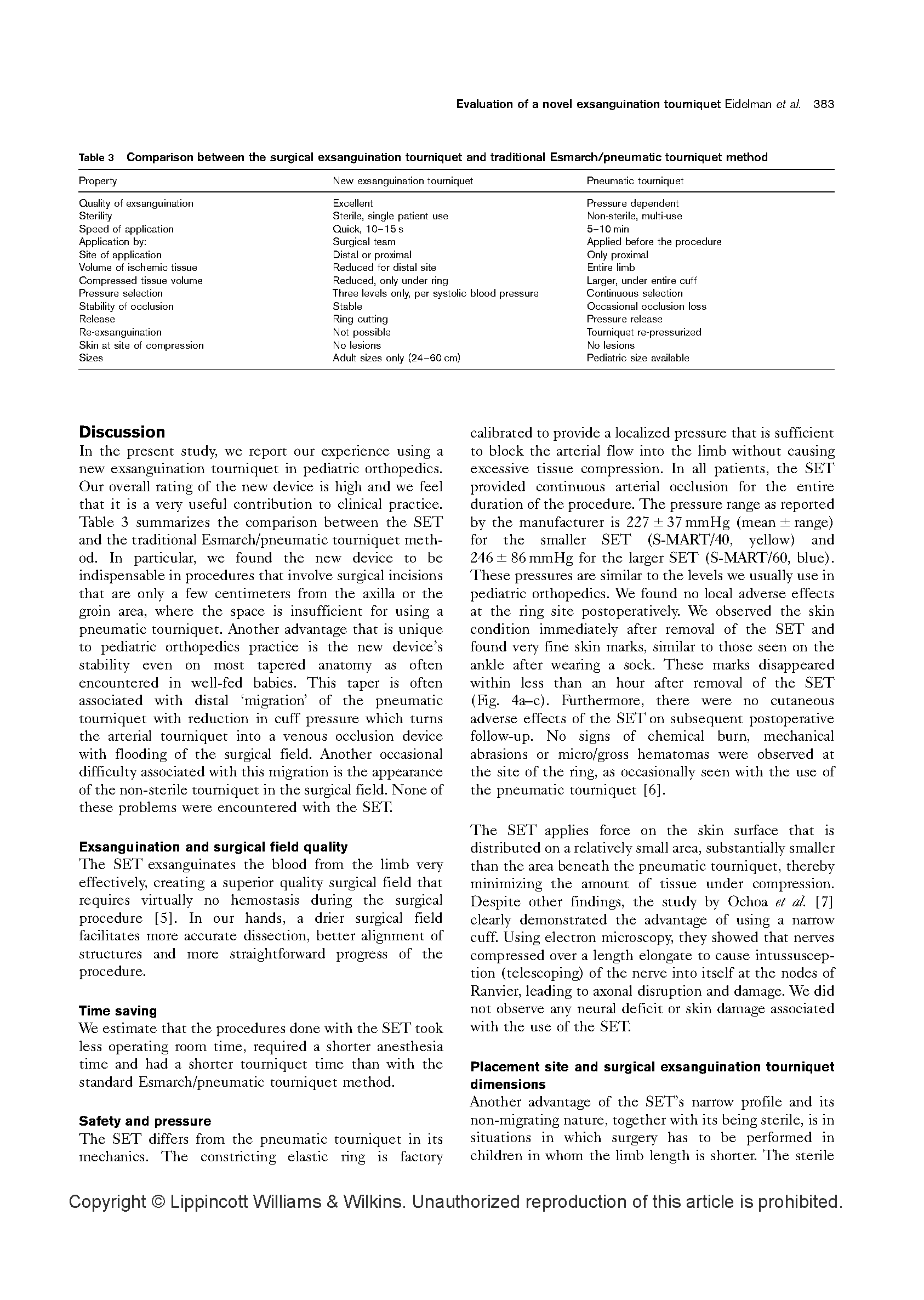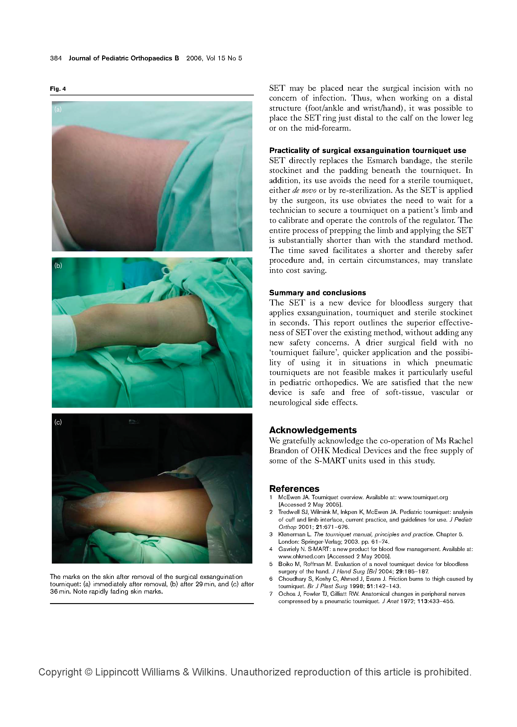 我们在文中描述了在临床上使用一个新的小儿外科矫正术驱血带(OHK)。我们评测了这个驱血带的性能,同时在临床上在51位患者身上应用,比较了这个新的驱血带与常规应用的充气止血带、无菌织布的区别。通过应用这个OHK驱血止血带,我们发现驱血是迅速的,并且有很好的手术视野。同时也没有副作用和局部缺血并发症的出现。在术后去除硅橡胶环,被硅橡胶环压迫下的皮肤也没有损伤。我们通过实践推断出结论,这个外科驱血止血带在是安全的、很有价值的。