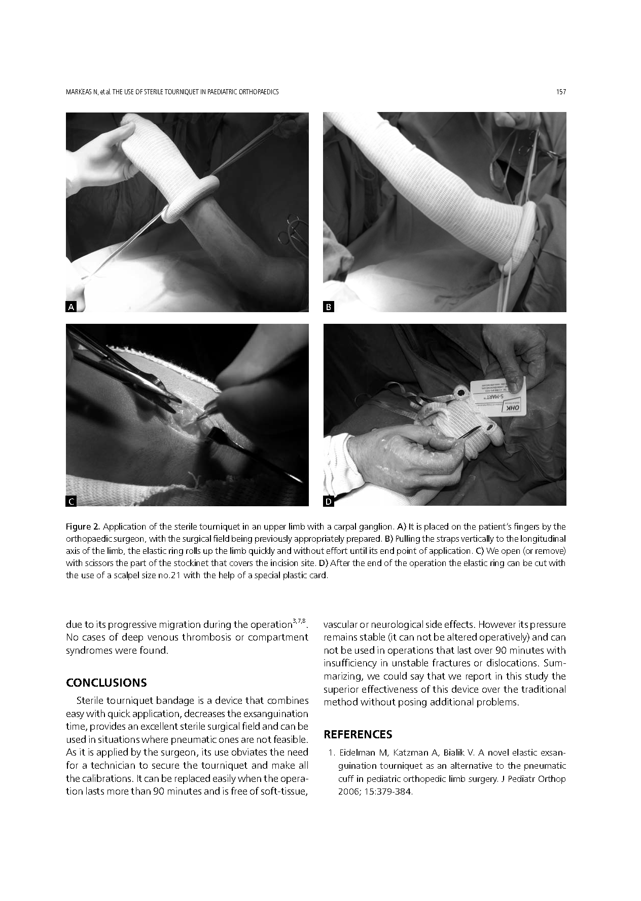 无菌止血带使用简单、能缩短手术中驱血耗时、成功获得无菌术野、在90分钟手术后易于移除。而且移除后没有出现皮肤皱襞或坏死,手术过程中不需要护士的帮助。实时稳定的压力(不能上下调节)是主要关注的问题,不允许在不稳定骨折或脱位及需90分钟以上时间的手术中使用。