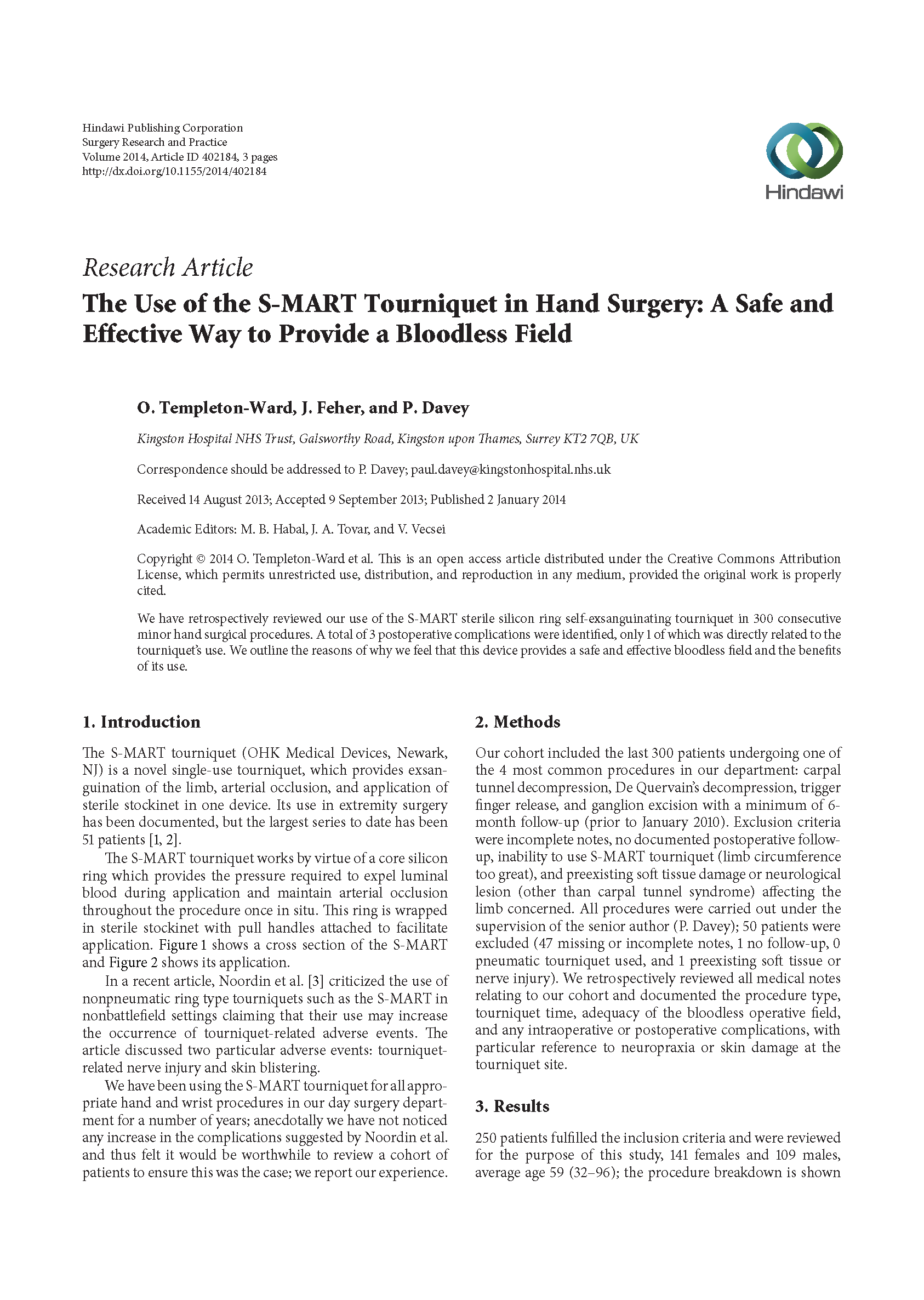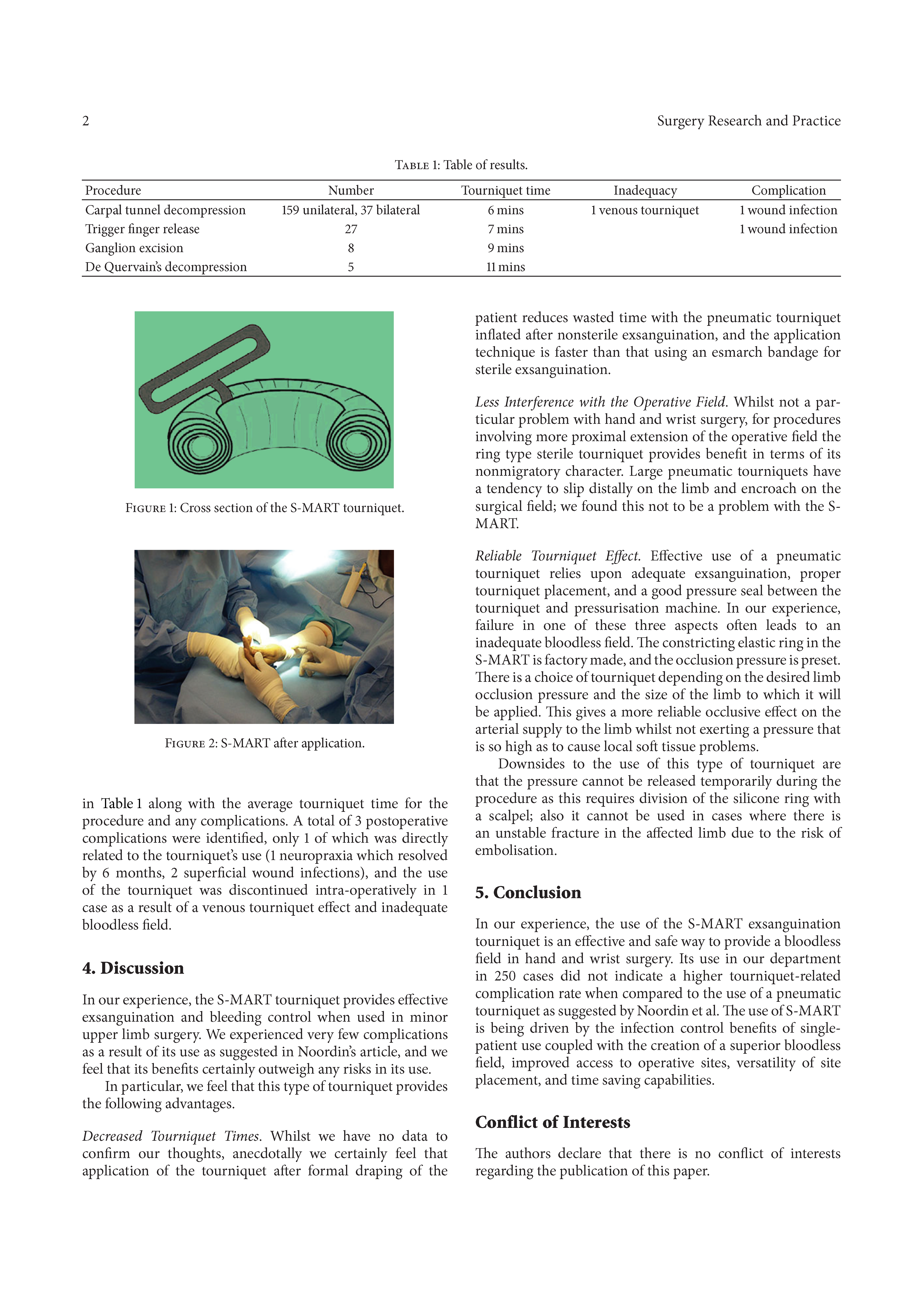 我们已经在日常的手和手腕手术中使用S-MART止血带很多年了。说来有趣,我们并没有发生Noordin所说的增加并发症的问题,因此这群病人是值得报道的,来确保事情属实。