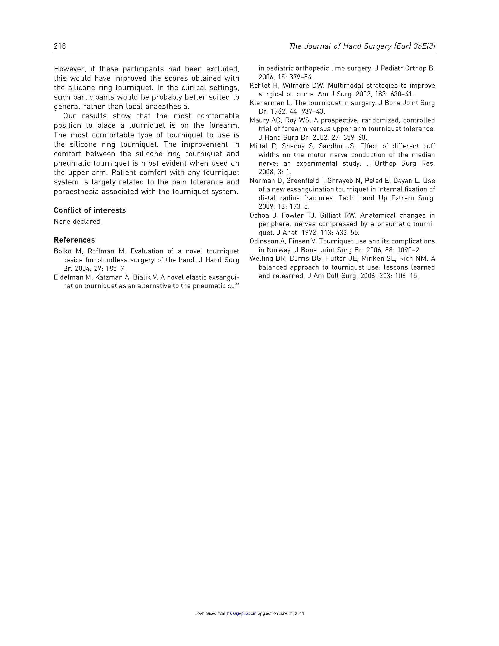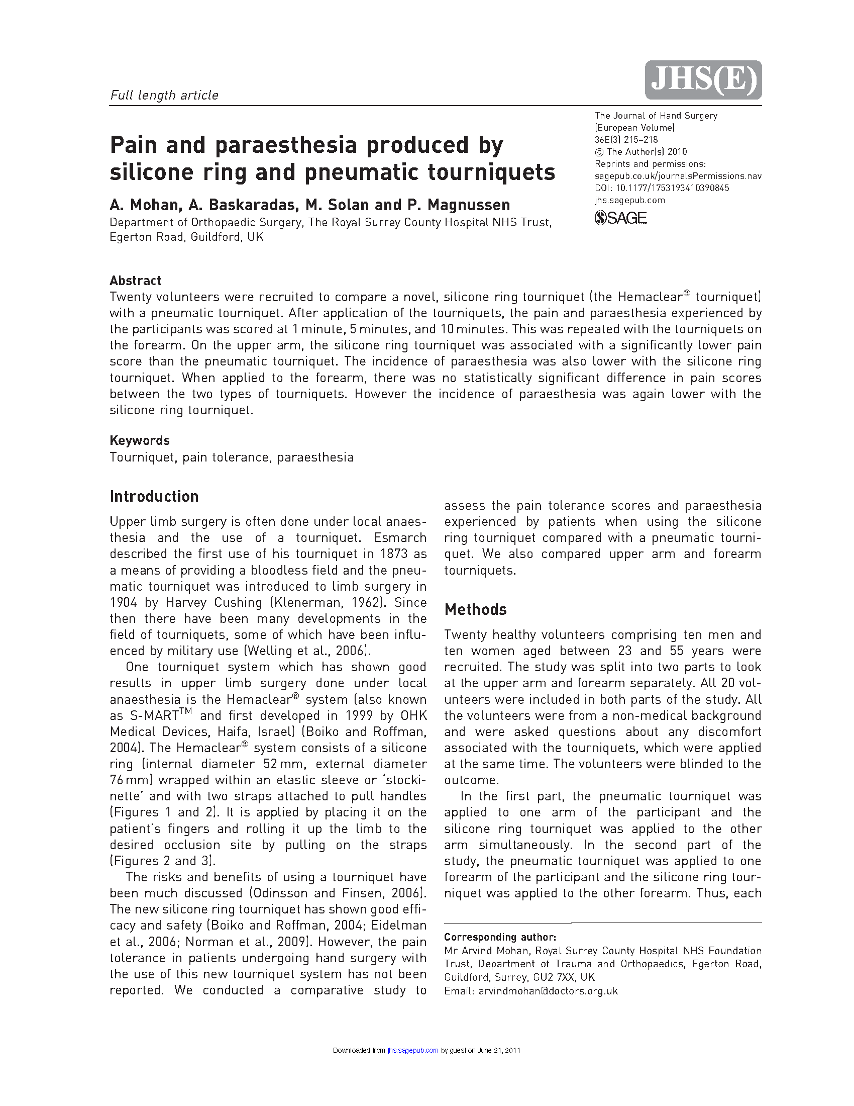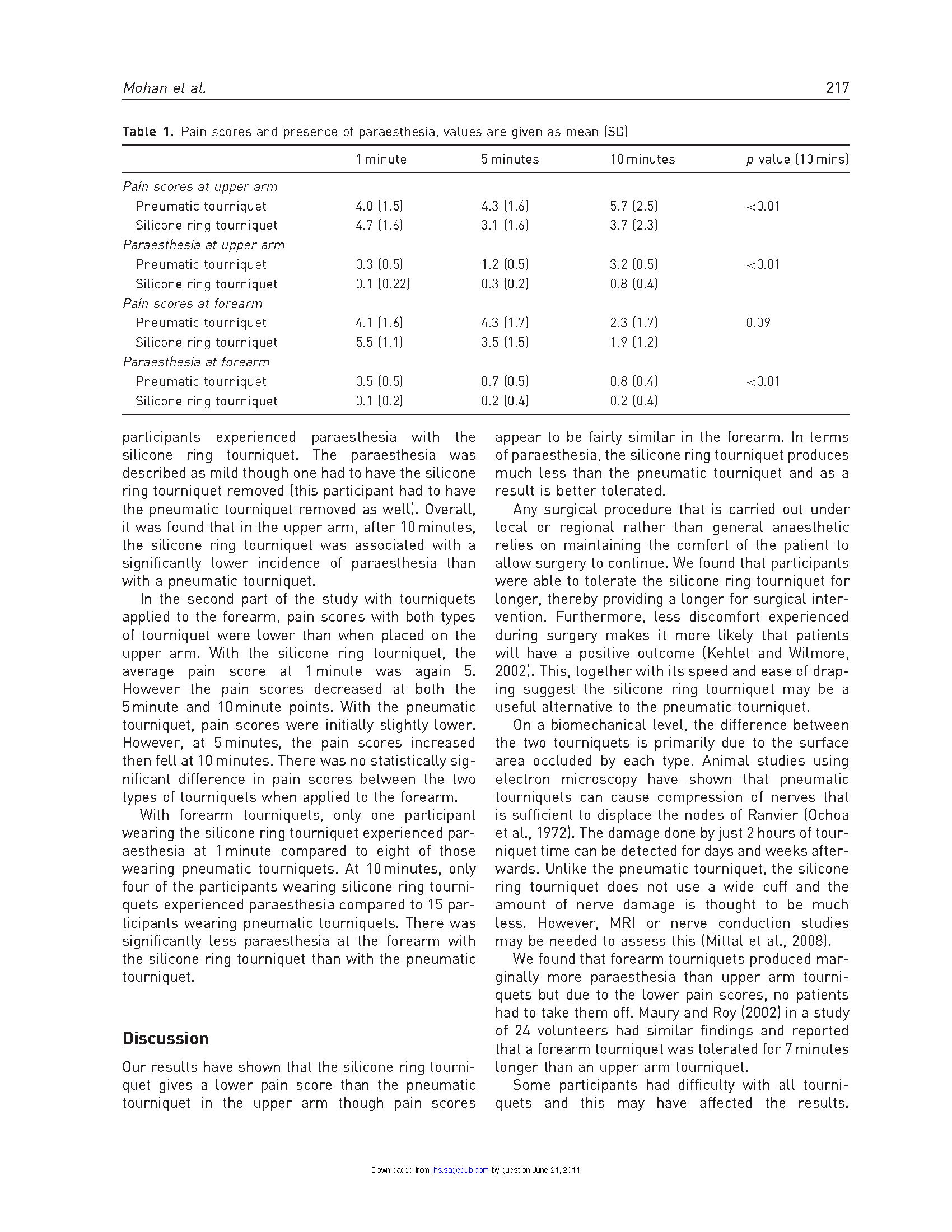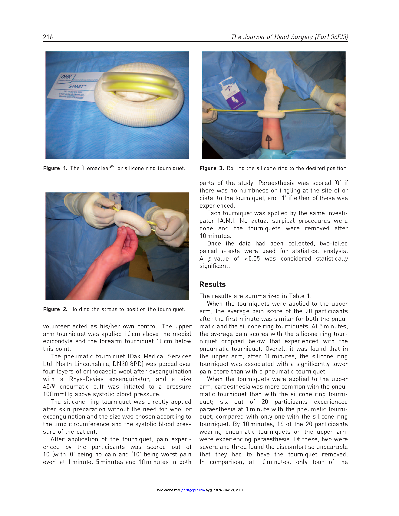 招募了20名使用新型硅胶环止血带和气囊止血带的志愿者进行比较。对使用止血带后1分钟、5分钟、10分钟的疼痛感和不适感进行评分。对前臂、上臂进行重复试验,硅胶环止血带的疼痛评分低于气囊止血带,不适感的概率也更低。在前臂使用时,两种止血带的疼痛评分没有统计学差异,但不适感的概率更低。