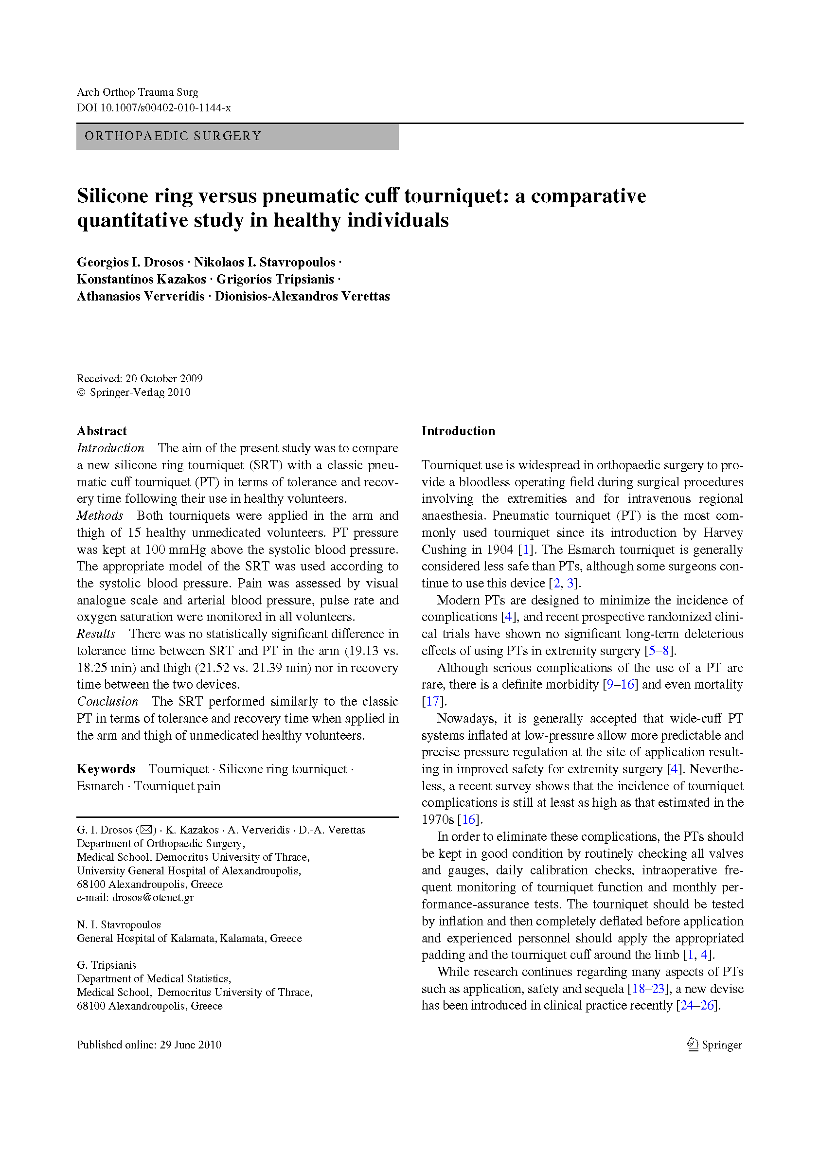本文旨在研究新型硅胶环止血带(SRT)和传统气囊止血带(PT)对健康受试者在使用时间和耐受性的方面的不同。