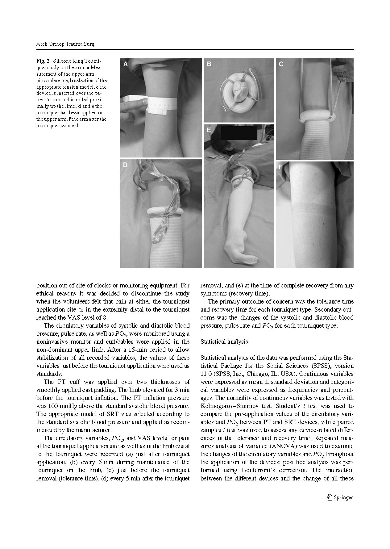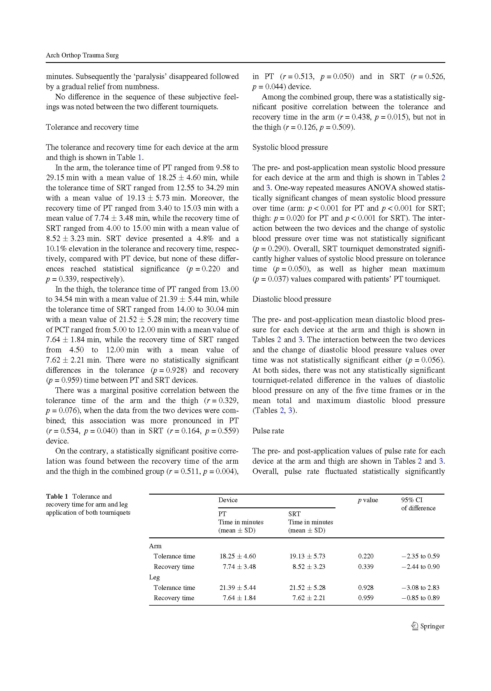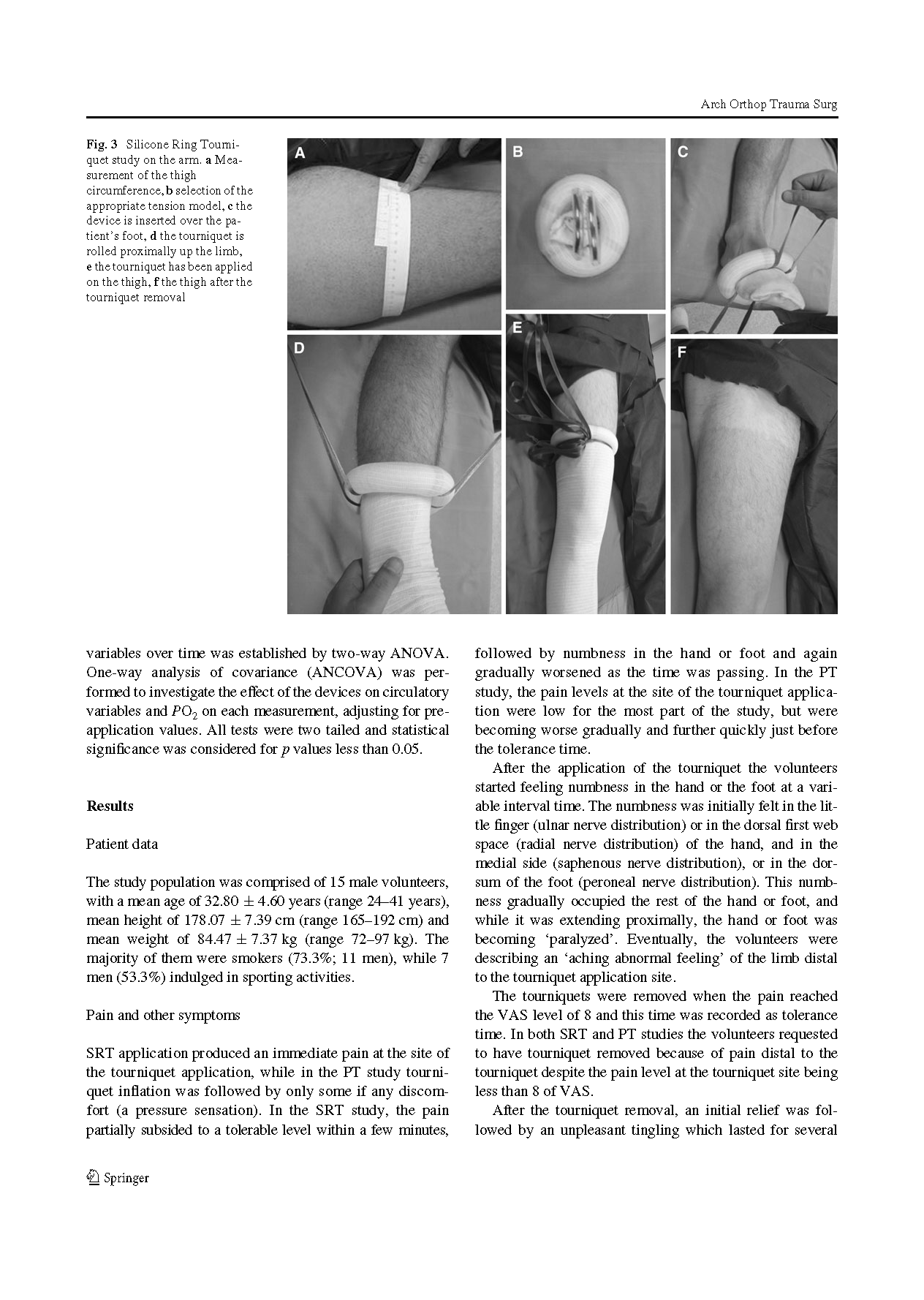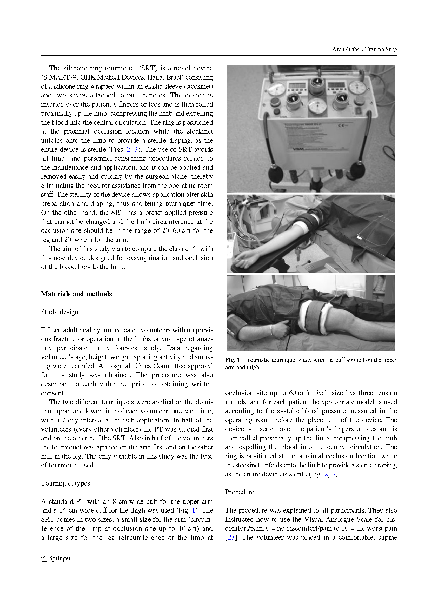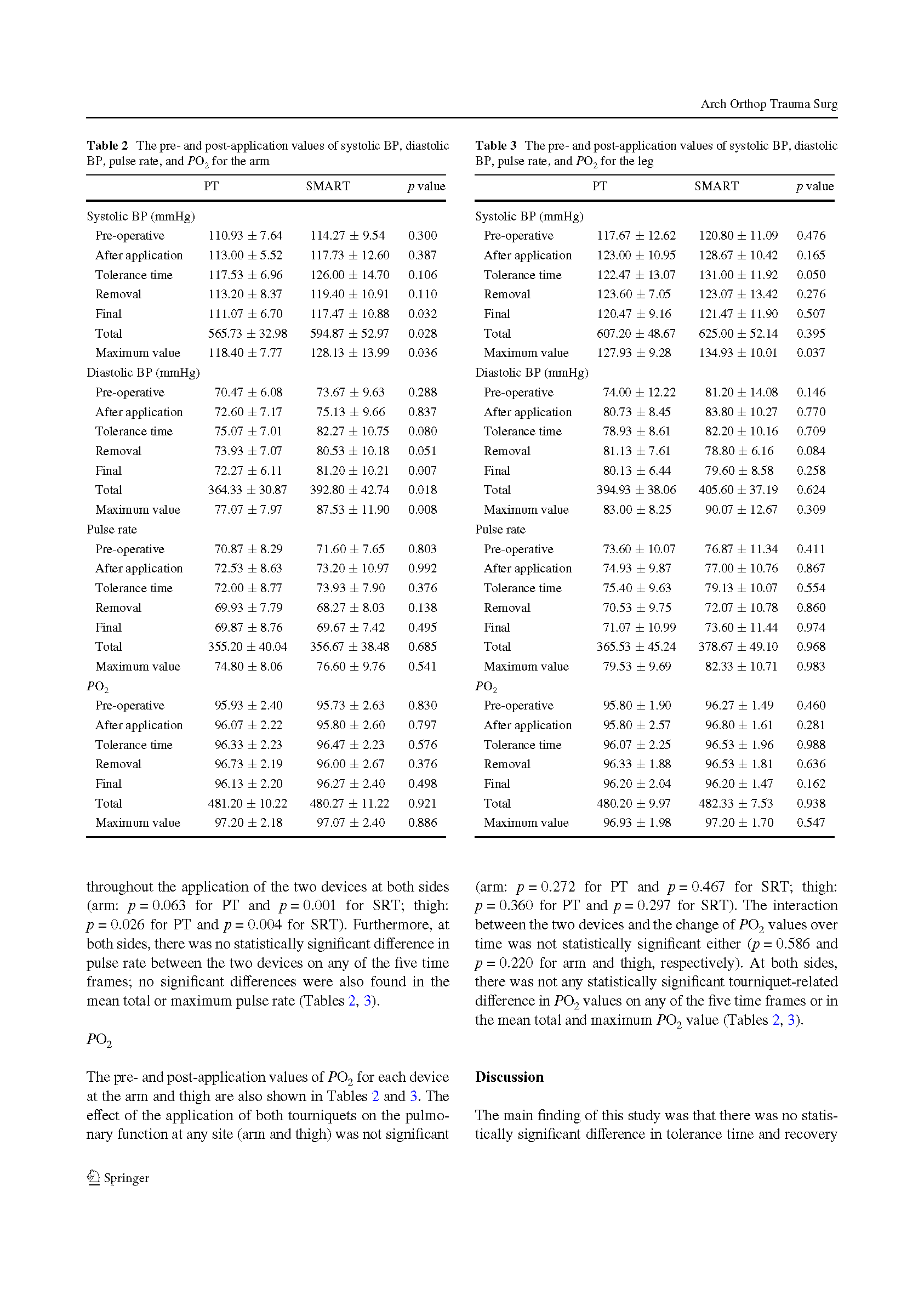 在15名健康受试者的手臂和大腿上使用这两种止血带。PT组收缩压压强保持在100mmHg以上。SRT需要根据收缩压选择合适的型号。受试者的疼痛通过视觉模拟评分、动脉血压、脉搏和氧饱和度来评估。