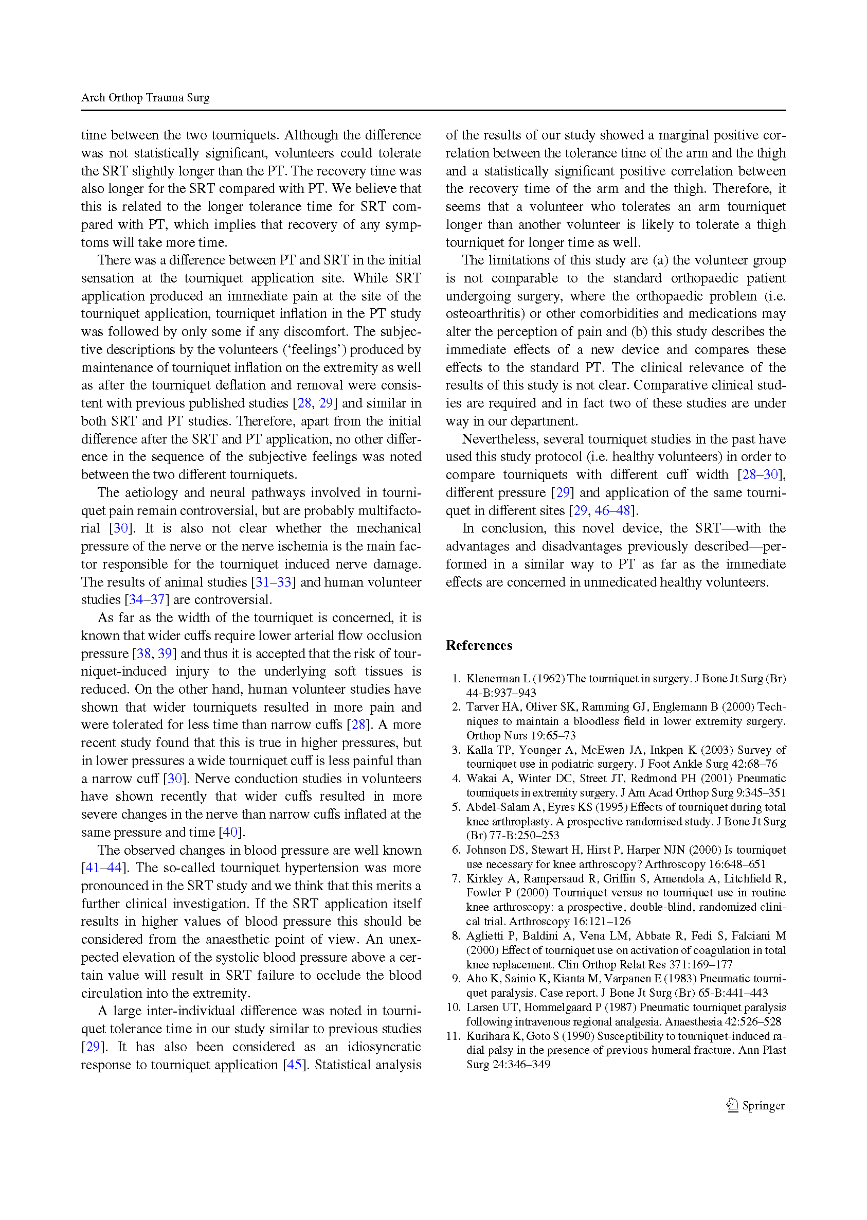 在健康受试者的上臂和大腿上使用两种止血带,SRT组在耐受性和使用时间上与RT组相似。