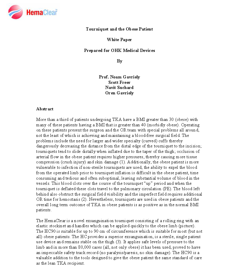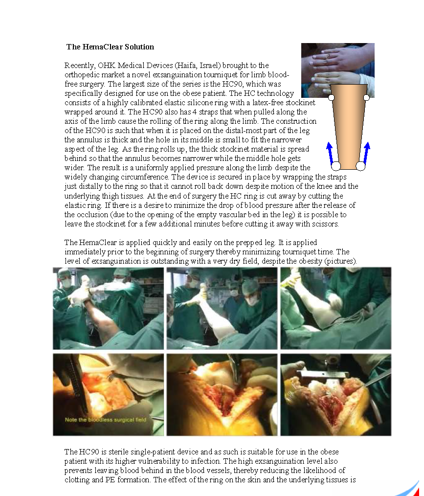 HemaClear是一种新型驱血止血装置,由硅胶环和拉绳组成,拉绳可以帮助肥胖肢体快速穿戴。HC90适用于大多数(非所有)肢体周长达90cm的肥胖患者。HC的驱血效果更优,是一种无菌、单人使用的装置,能稳定的停留在大腿上。此装置在8万多例手术中(不仅仅是肥胖患者)为肢体提供了安全的压力,获得了良好的安全记录(无瘫痪/麻痹,无皮肤损伤)。HC90能在TKA手术中简单快捷的为肥胖患者提供像瘦的患者一样的标准护理。