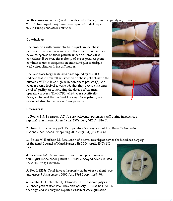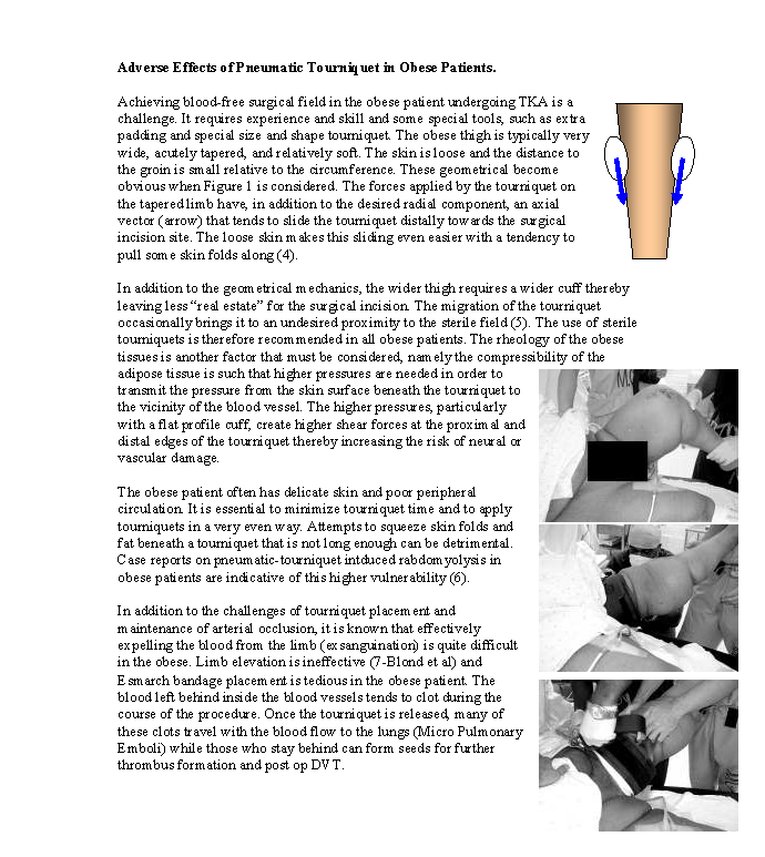 超过1/3接受TKA手术患者的BMI值大于30(肥胖),其中很多甚至大于40(重度肥胖)。为这类病人做手术需要处理很多特殊问题,不仅仅是获得无血术野这一方面。问题还包括需要更大更宽的套布,降低从止血带远端边缘到切口的危险;由于大腿粗度的增加止血带可能会从远端滑脱;对于肥胖患者动脉血流的阻断需要更高的压力,因此对组织造成了更大的压力(挤压伤)和皮肤损伤。另外,如果没有无菌止血带肥胖患者更容易被感染;对于肥胖患者来说,在气囊加压之前将血液从手术部位驱走更为困难,耗时更长,且不易驱血干净,血管中残留大量的血液。血栓出现在止血带部位之上,当止血带移除后血栓进入肺循环(PE)。残留的血液影响手术视野,不良的术野需要耗费更多的时间来止血。然而,TKA手术中使用止血带的肥胖患者和正常患者的整体长期结果一样好。