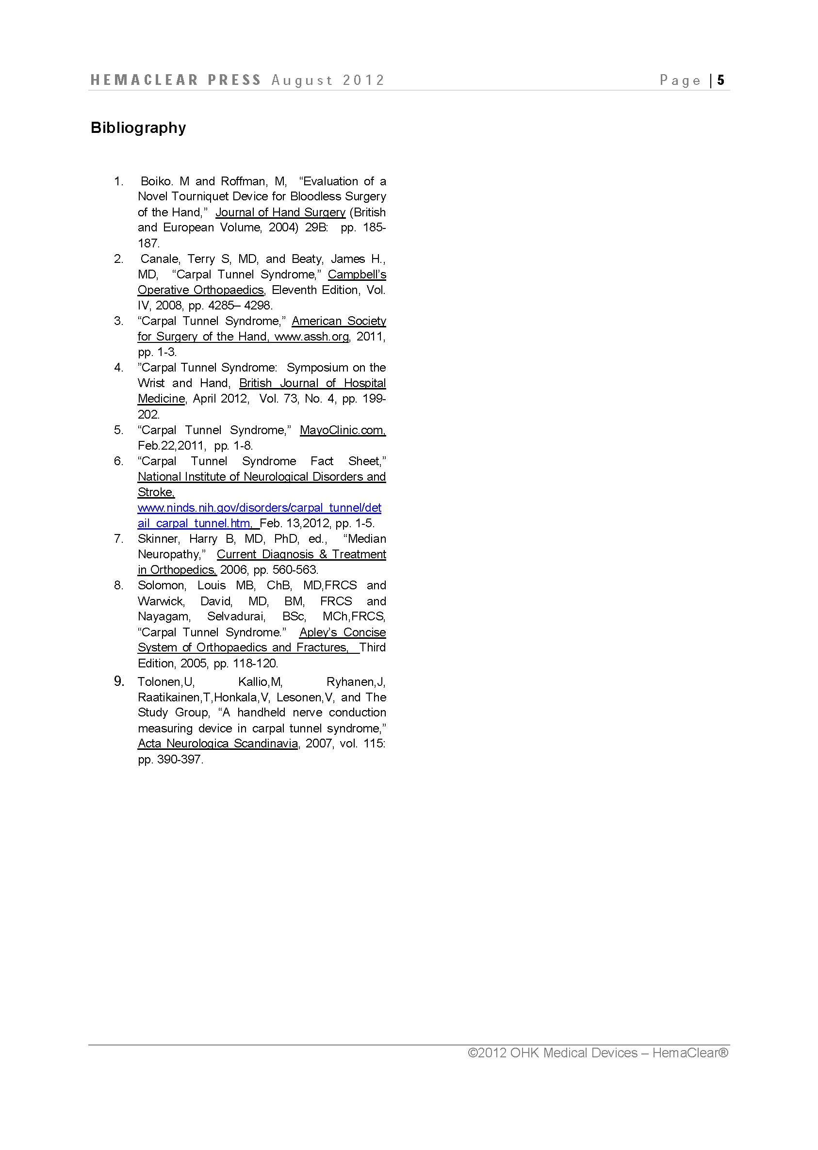 腕管综合征是最普遍的神经并发症,其中每年0.3%的人口1/3需要进行腕管综合征手术。它的发病归因于手部正中神经在通道内挤入手掌部造成的。症状是中指和拇指的麻木和疼痛,拇指根部的肌肉无力。经过保守治疗的尝试,1/3的患者是需要进行外科手术的,在门诊进行手术时需要无血条件和局部麻醉。无菌前臂HemaClear是安全有效的装置,并可以提供一个无血的手术区域。
