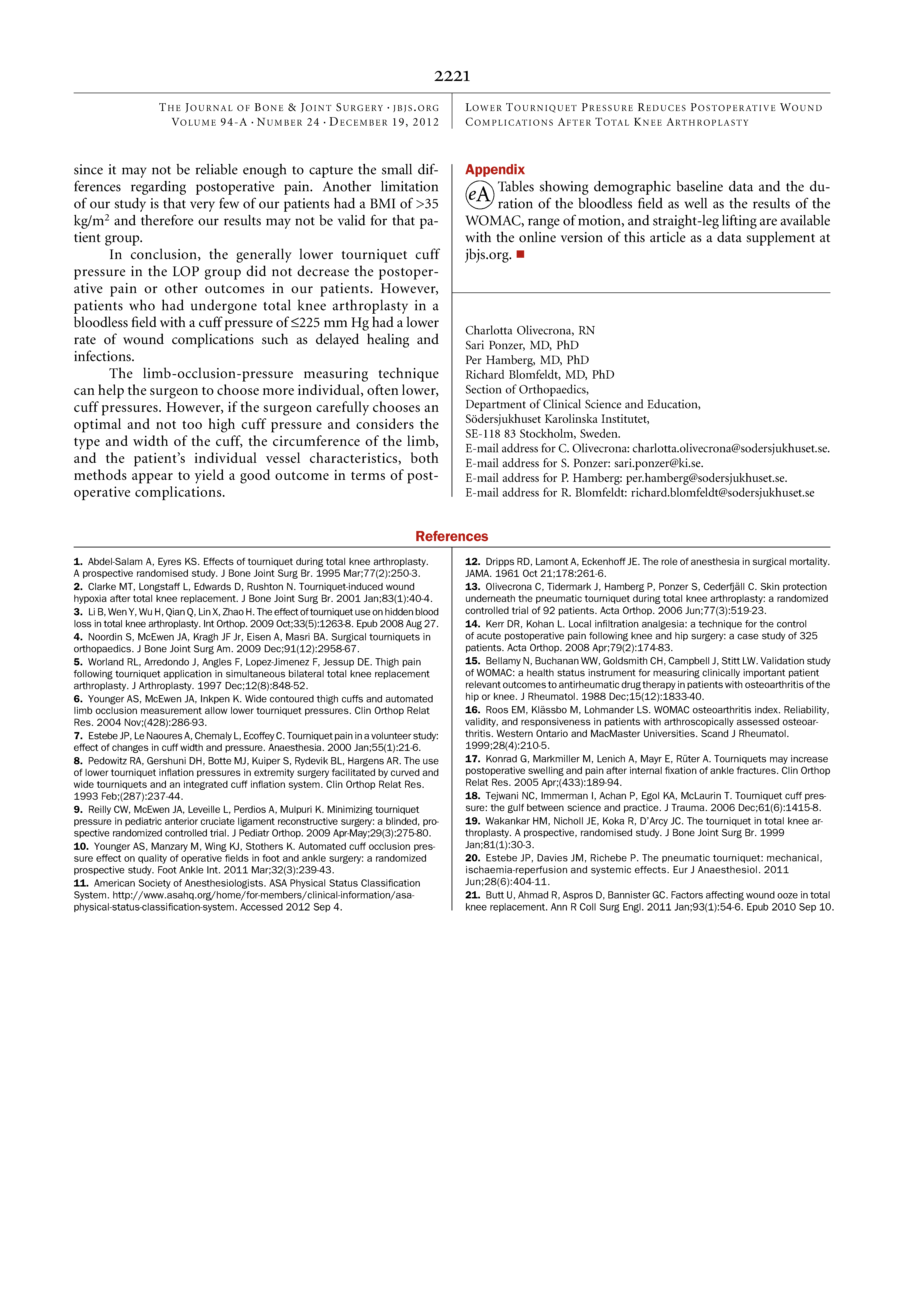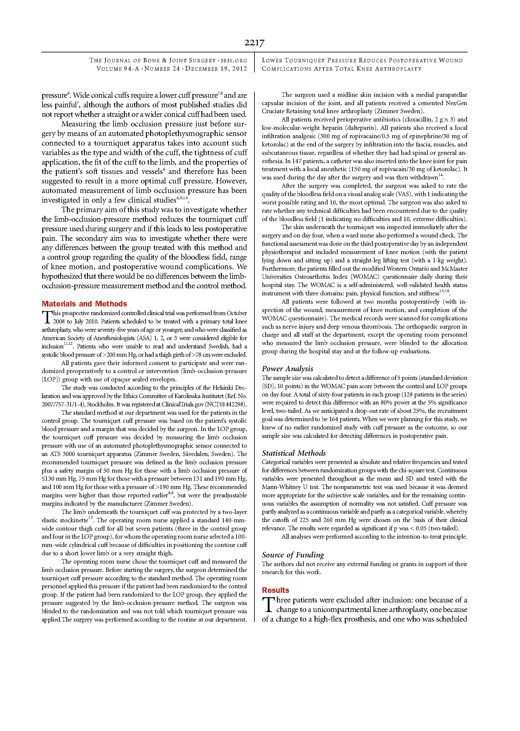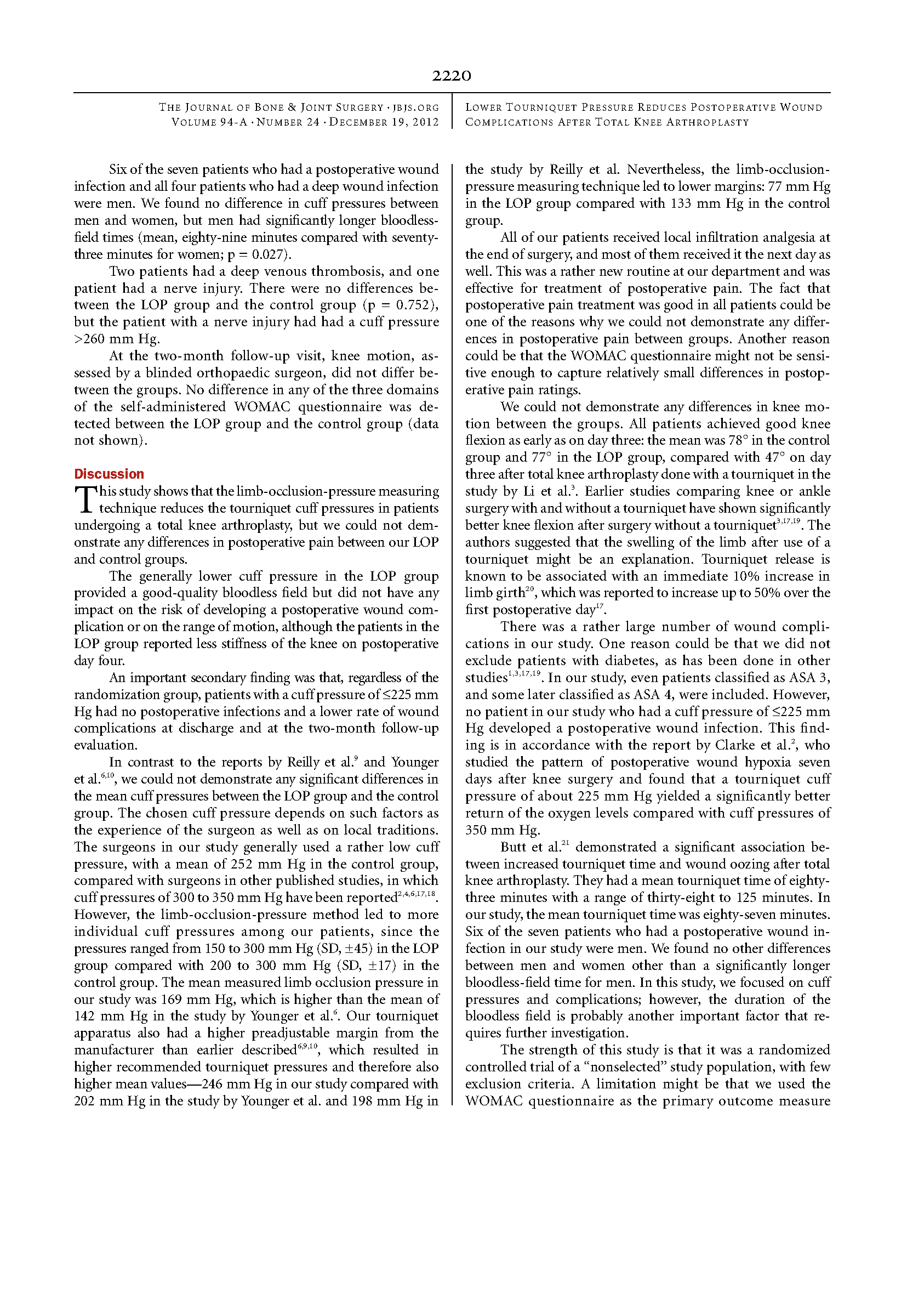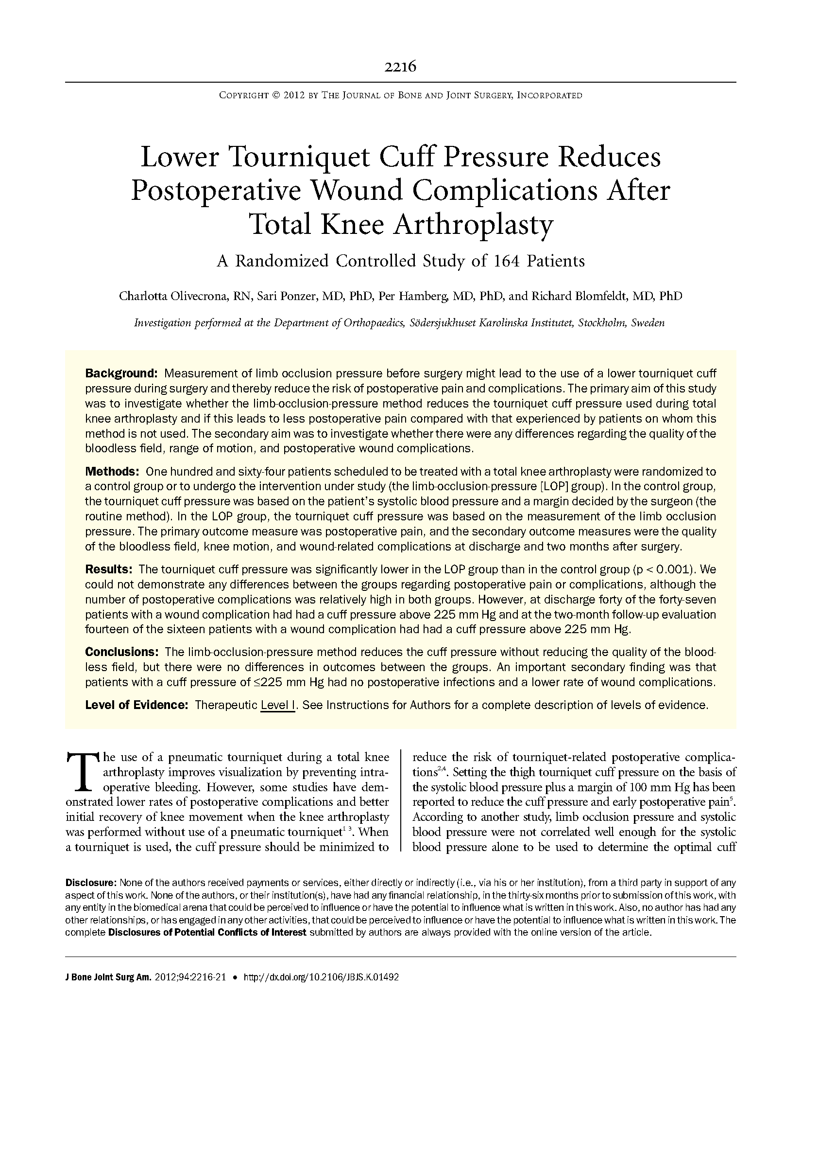 通过肢体闭塞压方法来降低袖口压力,但是没有降低手术区域的驱血量,但是这两组实验结果没有什么不同。还有一个重要的发现,当患者的袖口压力≤225mmHg时,没有术后感染并且有比较低的伤口并发症的发病率。