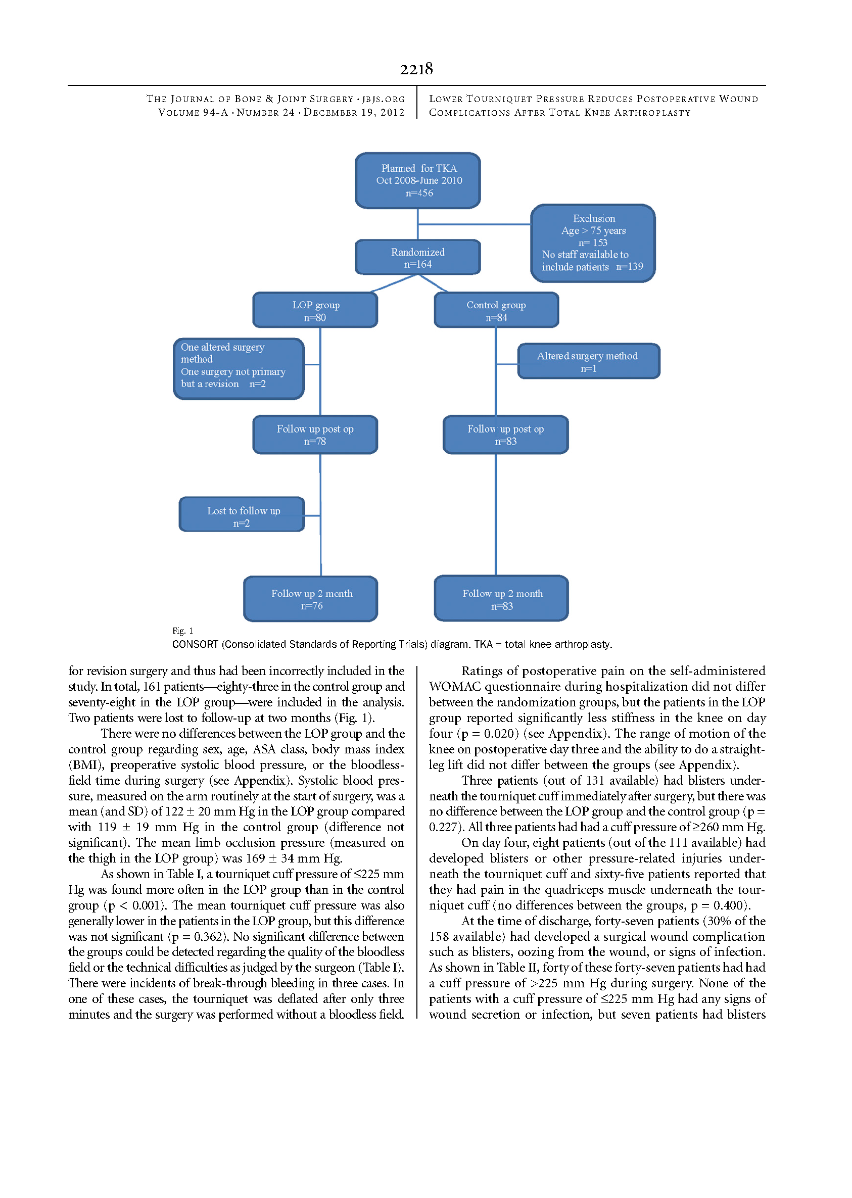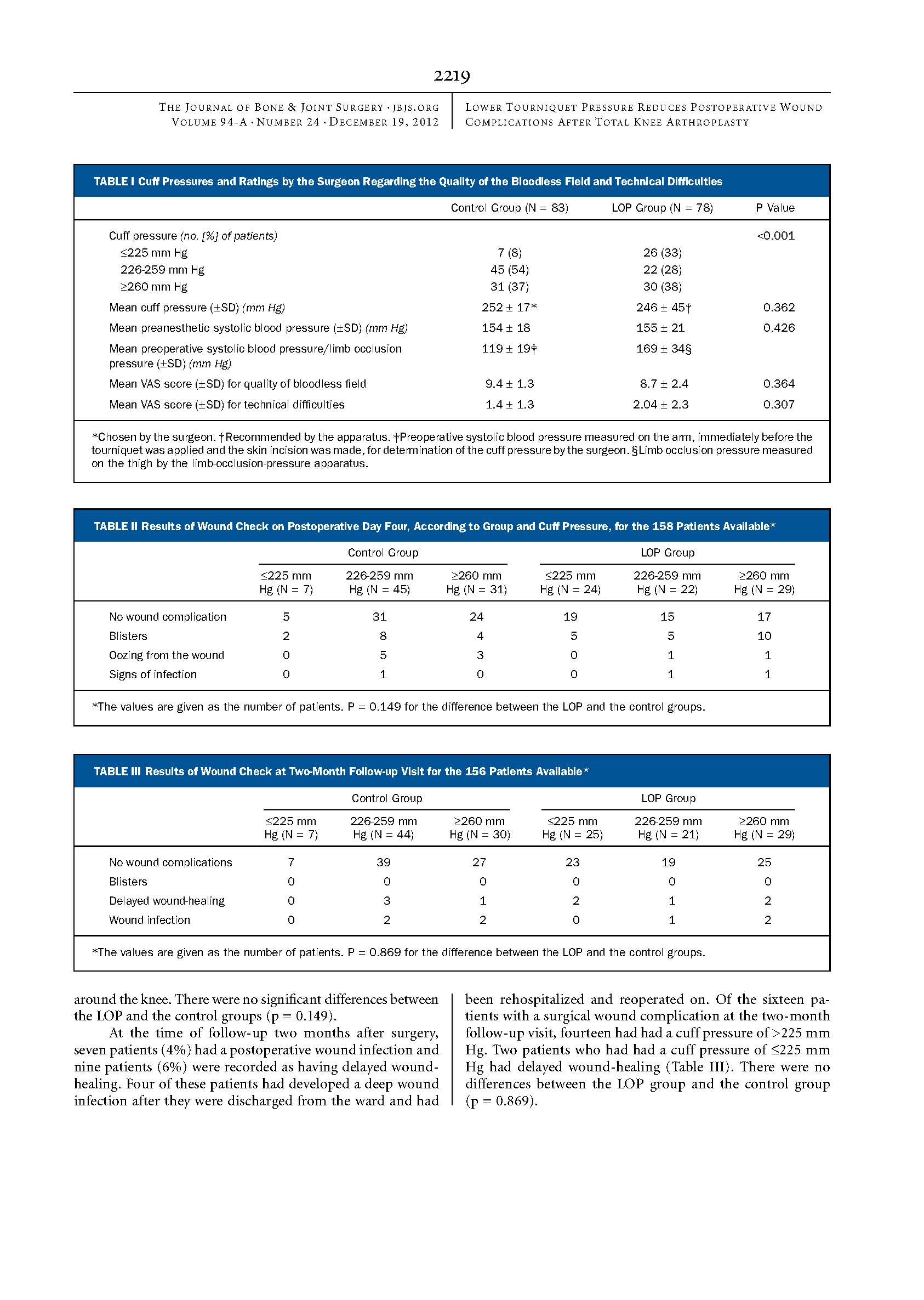 在实验组止血带袖口压力是明显低于对照组的。虽然这两组的术后并发症都是相当高,但是我们不能证明这两组在术后疼痛和并发症方面有什么不同。然而出院后,袖口压力大于225mmHg的47位患者中40位患者有术后伤口并发症,并且16位患者中的14位术后2个月伴随有伤口并发症。