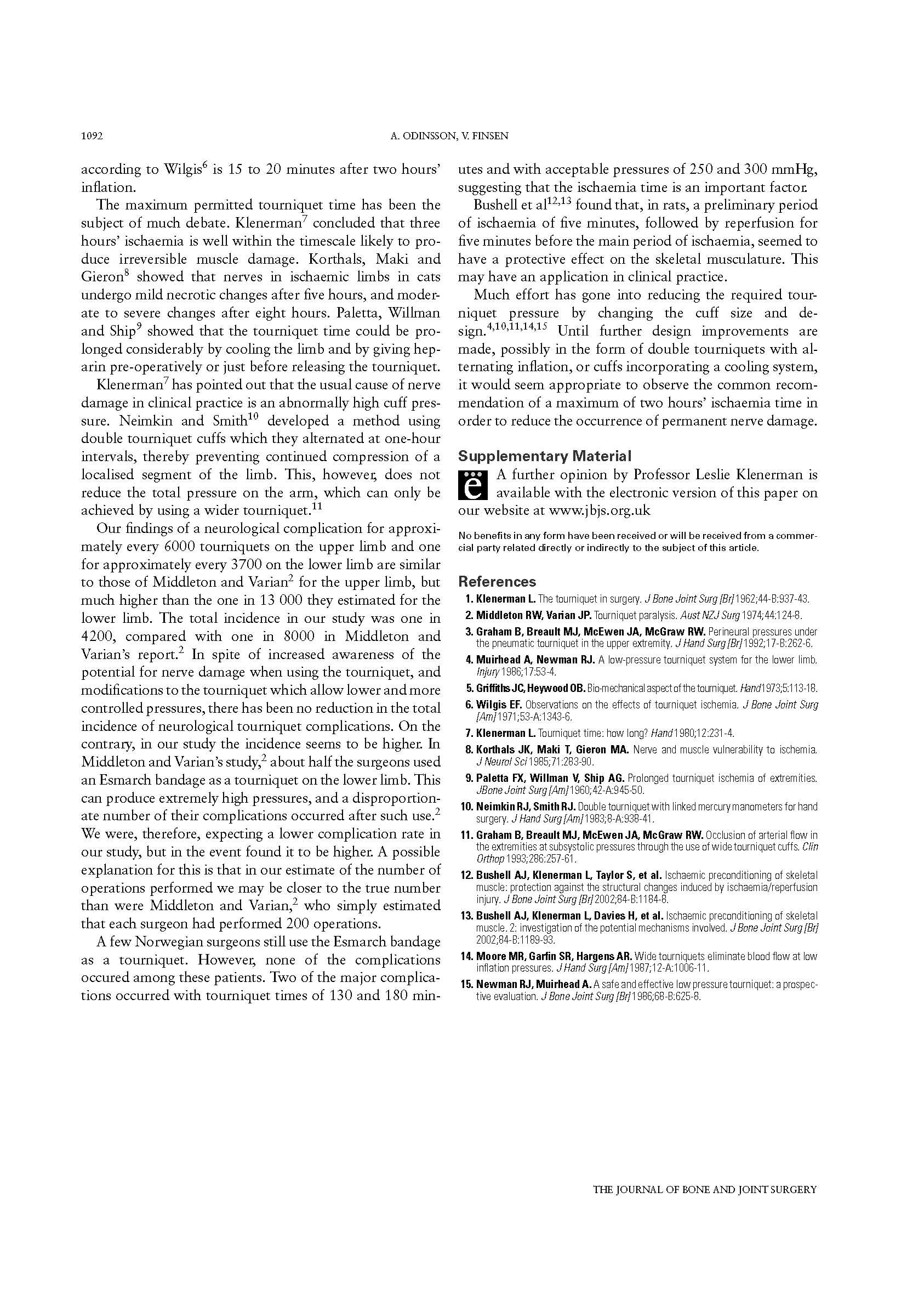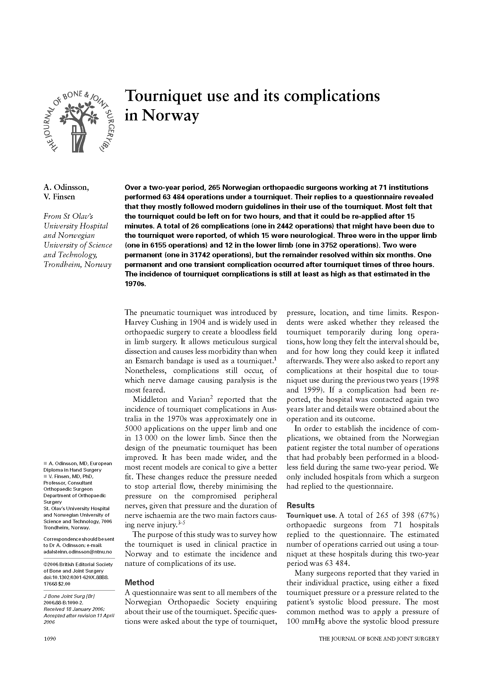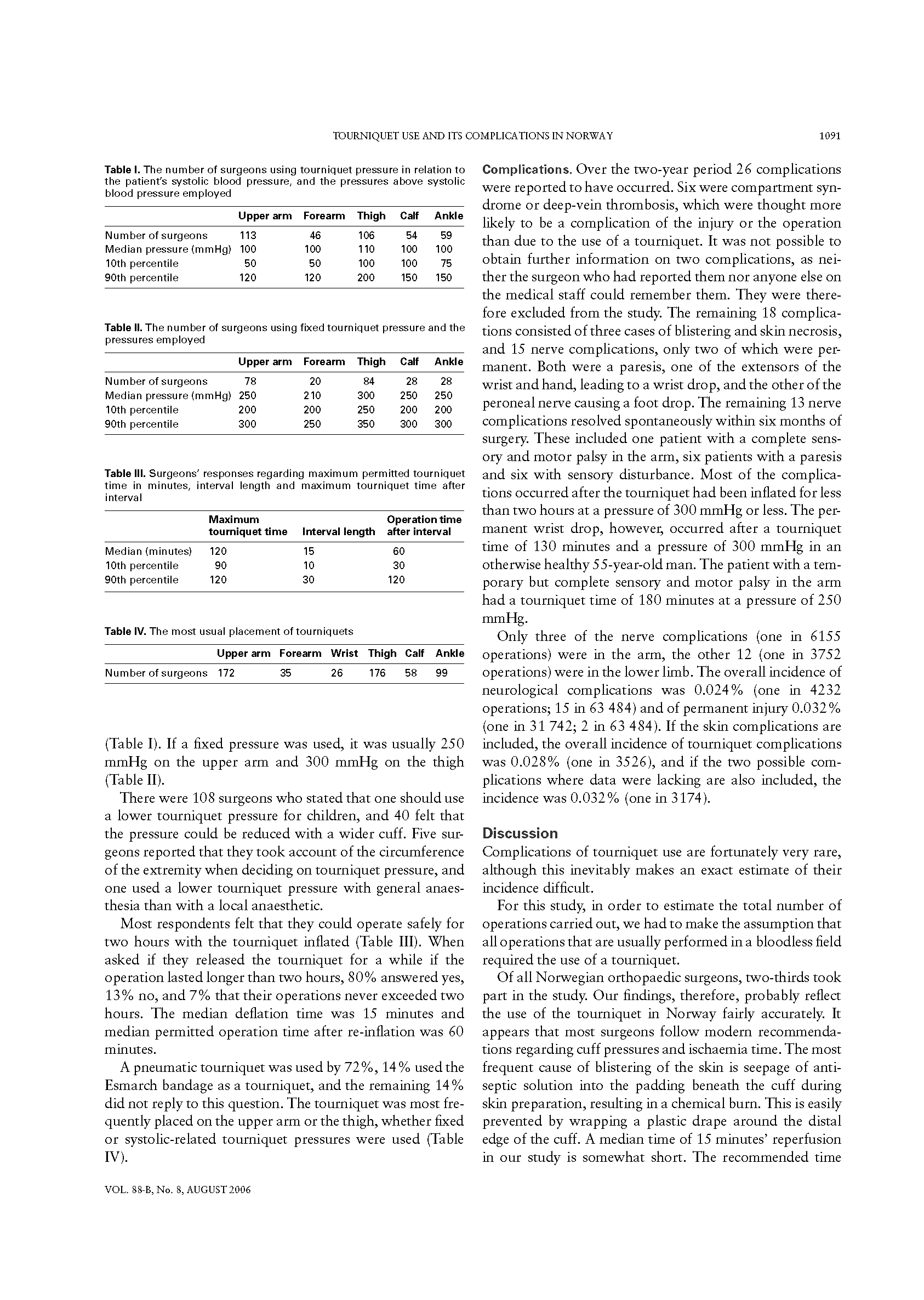 在两年时间里,71家机构的265位挪威的整形外科医生使用止血带进行了63484例手术。对他们的调查问卷表明他们在使用止血带过程中遵循现代的指导方针。多数医生表示止血带可以停留2小时,并且15分钟后再次使用。有报道使用止血带造成了共26项并发症(1/2442例手术),其中15项是神经方面的。上肢并发症3项(1/6155例手术),下肢并发症12项(1/3752例手术)。两项是永久性的(1/31742例手术),其余的在6个月内缓解。一项永久性和一项暂时性并发症发生在使用止血带超过3小时情况下。止血带并发症仍然高达1970年代的估值。