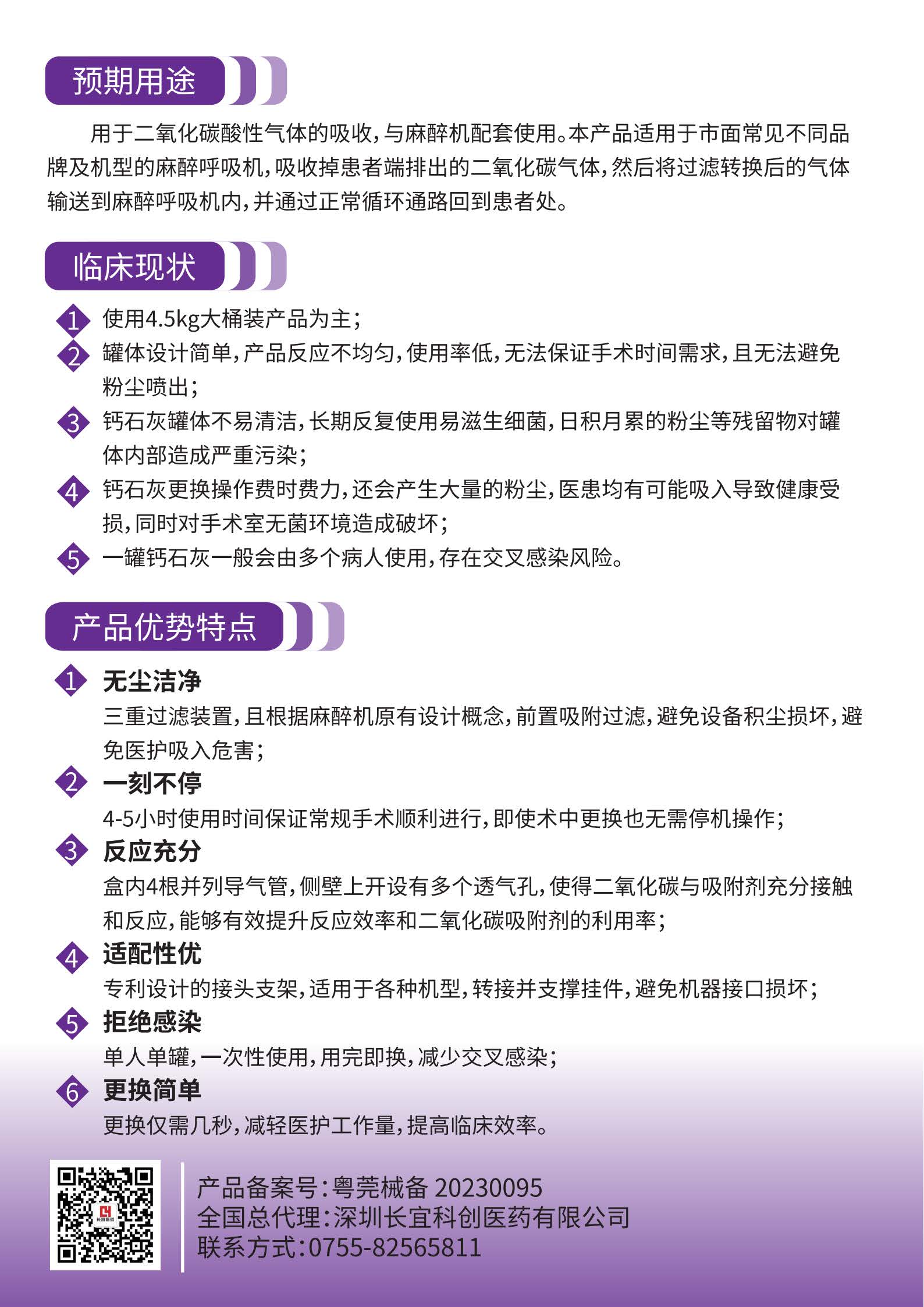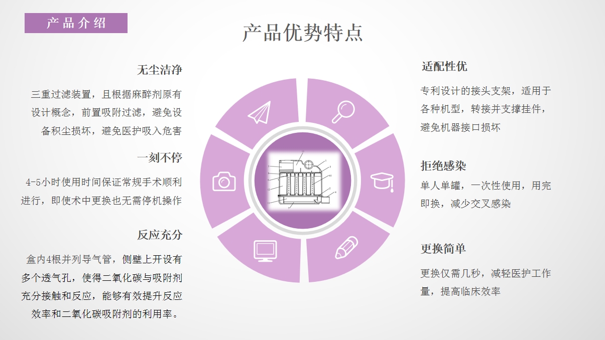 【适用范围】用于二氧化碳酸性气体的吸收,与麻醉机配套使用。产品可用于市面常见不同品牌及机型的麻醉呼吸机上,用来吸收掉患者端排出的二氧化碳气体,然后将过滤转换后的气体输送到麻醉呼吸机内,并通过正常循环通路回到患者处。